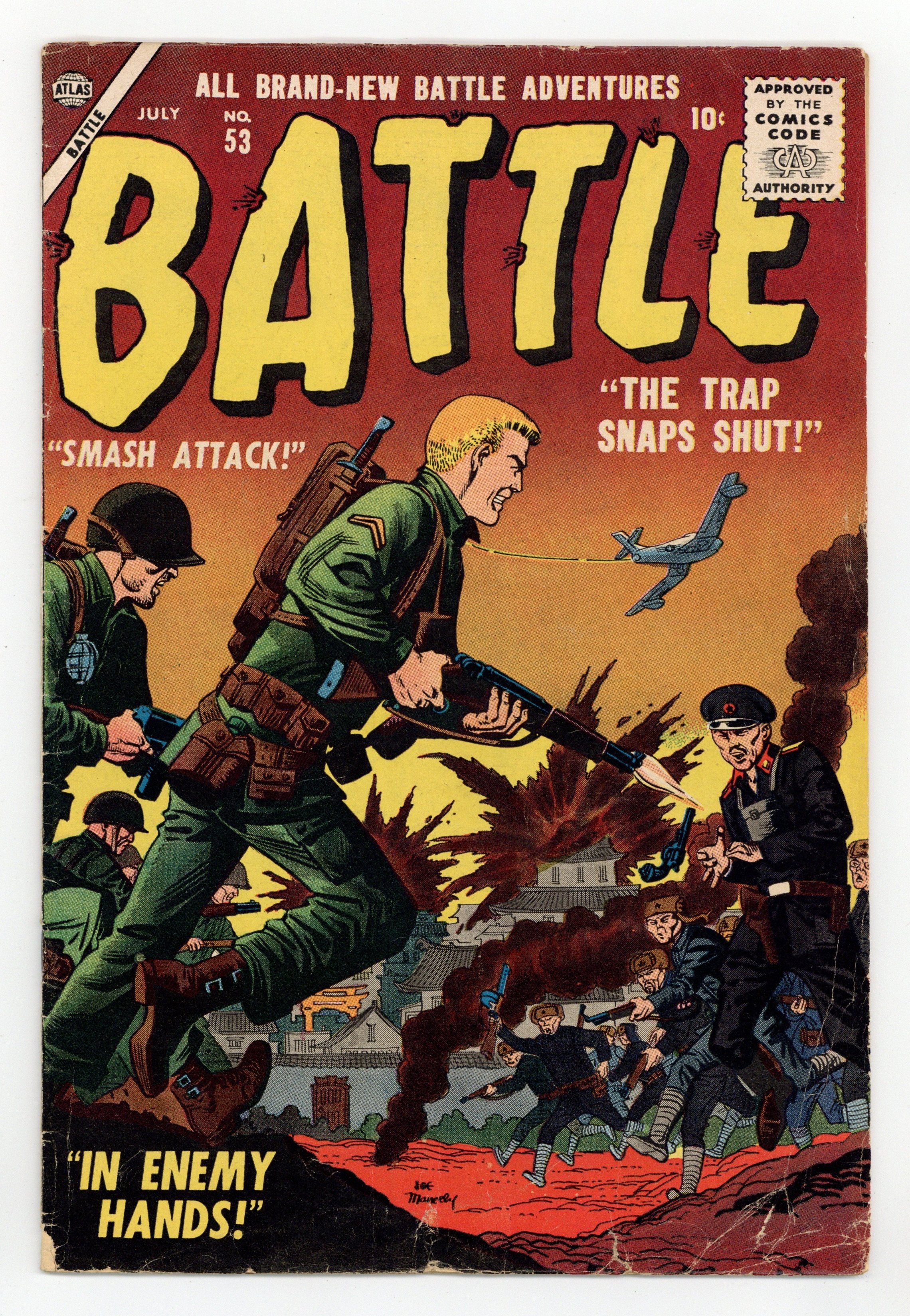 "The Hard Way" (art by Gene Colan), "The Trap Snaps Shut!" (art by John Romita Sr.), "Smash Attack," "In Enemy Hands!" (art by Frank Bolle), "Traitor!" (art by Jay Scott Pike), and a two-page text story, "Trapped." Joe Maneely cover. Cover price $0.10.