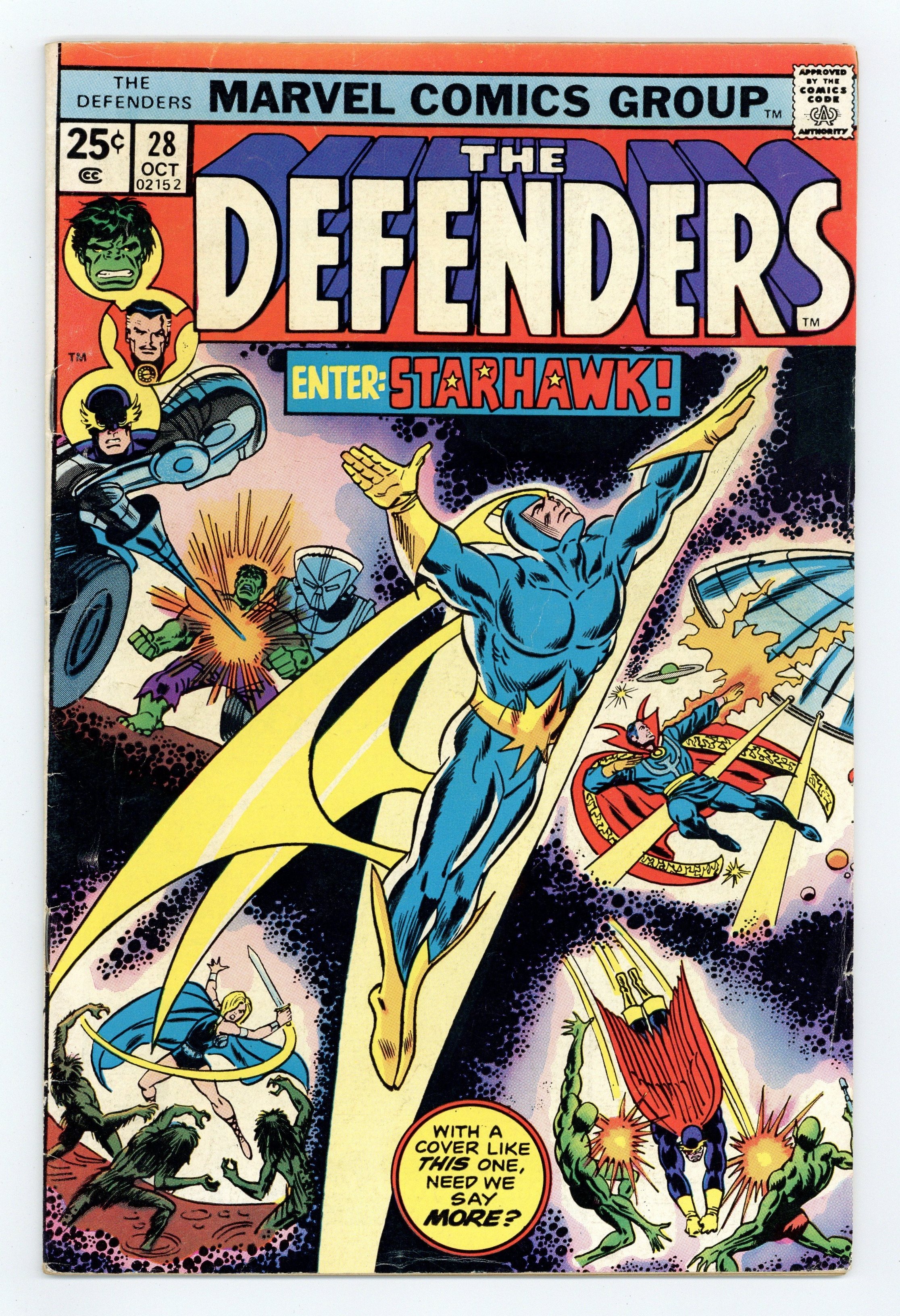 $16.75Cover pencils by Ron Wilson, inks by Frank Giacoia. First full appearance of Starhawk in My Mother, The Badoon!, script by Steve Gerber, pencils by Sal Buscema (layouts/breakdowns), Frank Giacoia (Finished Art), and John Tartaglione [as John Tartag] (Finished Art), inks by Frank Giacoia and John Tartaglione [as John Tartag]; Nighthawk, Charlie-27 and Martinex are captured by the Badoon; Starhawk helps Vance Astro and Valkyrie return to Earth; Hulk and Yondu are forced to enter the Super-Death Sweepstakes. 36 pgs. $0.25. Cover price $0.25.
