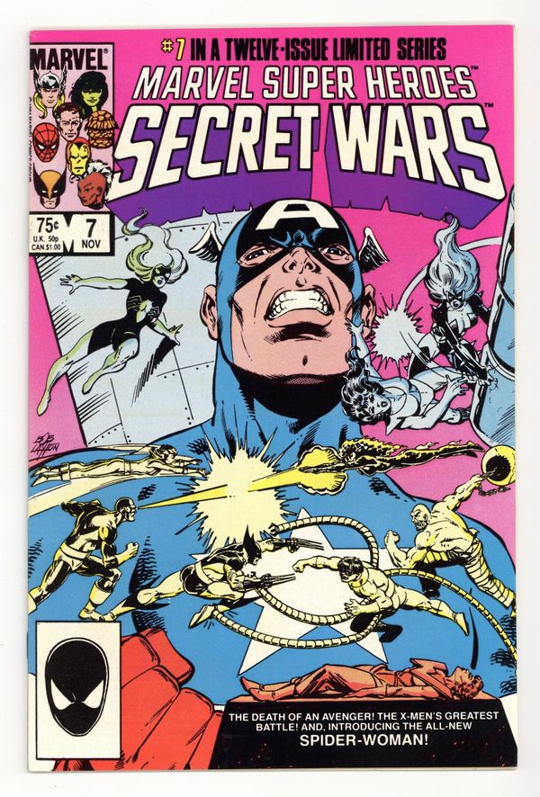 Tags: Secret Wars (1984) (part 7)$12.00Direct Edition. 1st appearance of Spider-Woman II (Julia Carpenter). "Berserker!" Part 7 of 12. Story by Jim Shooter. Art by Mike Zeck and John Beatty. Introducing Marvel's newest super-hero, Spider-Woman, a refugee from the displaced Denver, Colorado (NOTE: The Beyonder created Battleworld from pieces of hundreds of worlds from across the universe, Denver was one of those pieces). Plus, when the villains dump the Wasp's lifeless body into the heroes' camp, the Savage She Hulk decides to pay the bad guys a visit for some payback. But, has the emerald heroine finally bitten off more than she can chew? 36 pages, full color. Cover price $0.75.