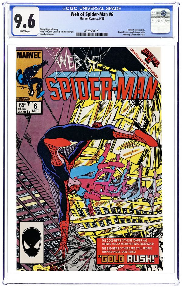 Direct Edition. "Gold Rush!" Secret Wars II crossover. Story by Danny Fingeroth. Art by Mike Harris, Bob Layton, Jim Mooney, Dave Simons, and Mike Zeck. Cover by John Byrne. The Beyonder has just turned Power Man and Iron Fist's office building into solid gold! Now the building has collapsed upon itself, and office workers are trapped inside! It's up to Spider-Man to rescue the wounded and perhaps grab a golden souvenir after he is finished. The story continues in Amazing Spiderman 268. Cameo appearances by the Kingpin and President Reagan. (Note: The cover of this issue can be paired with the cover of Amazing Spiderman 268 to form a complete image of the office building turned to gold.) 32 pages Cover price $0.65.
