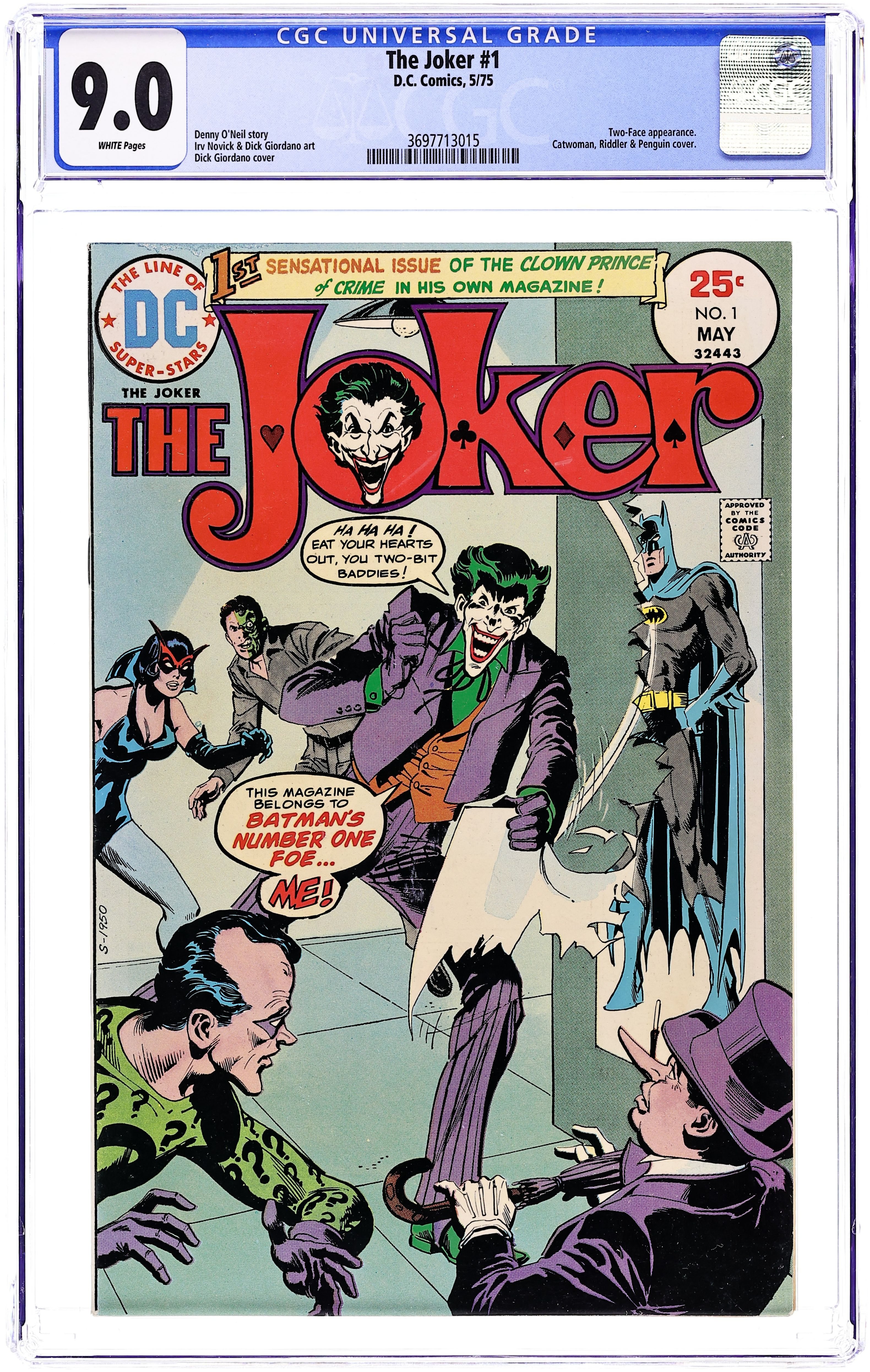 Cover by Dick Giordano. "The Joker's Double Jeopardy!," script by Denny O'Neil, pencils by Irv Novick, inks by Dick Giordano; When a new criminal breaks Two-Face out of Arkham Asylum, claiming that he has need of "a truly master criminal", the Joker is incensed; Soon, the Clown Prince of Crime stages his own breakout and tracks down Two-Face, determined to show just who Gotham's number-one criminal truly is. Article on the creation of the Joker. Hostess Twinkies ad with Batman. 36 pgs., full color. $0.25. Cover price $0.25.