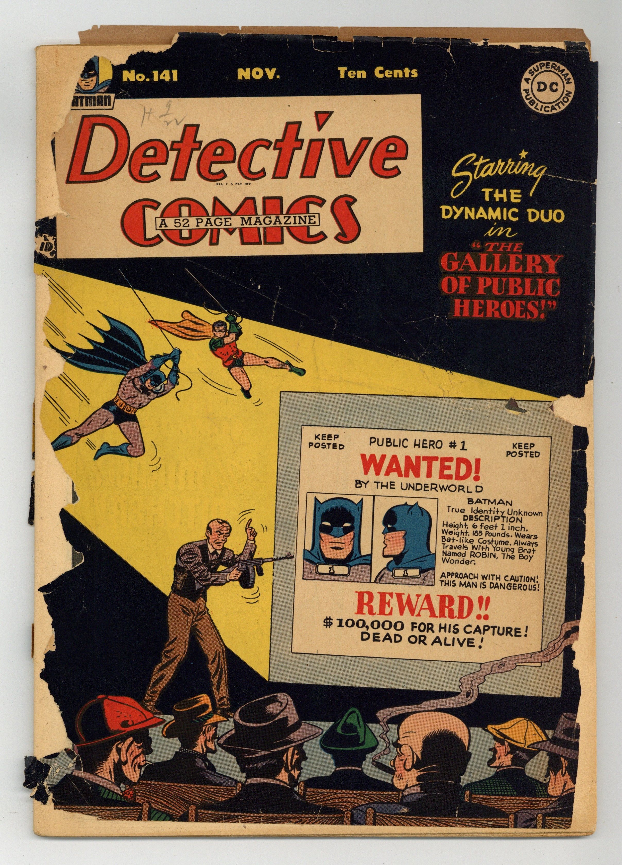 Cover by Bob Kane and Charles Paris. Stories by Otto Binder and unknown. Art by Jimmy Thompson, Bob Kane, Charles Paris, Howard Sherman, Curt Swan and Steve Brodie. Blackie Nason was captured because of his picture being in the police "Rogue's Gallery," so after he escapes from prison, he has plastic surgery, then sets up his "Gallery of Undercover Cops." And he accidentally uncovers the true identity of Batman, just wanting to scam the underworld element. Don't miss Batman and Robin in "The Gallery of Public Heroes!" with art by Bob Kane and Charles Paris. Plus: Robotman in "Robotman in the Moon!" by Otto Binder and Jimmy Thompson; Slam Bradley in "The Sinister Snow Man!" with art by Howard Sherman; and The Boy Commandos in "Find Me a Killer!" with art by Curt Swan and Steve Brodie. Also: Shorty half-pager by Henry Boltinoff; 1.5-page text piece "Secret Codes in Sports" by Henry Lysing; Daffy & Doodle half-pager by Lit-Win; and Jerry the Jitterbug half-pager by Boltinoff. 52 pages, full color. Cover price $0.10.