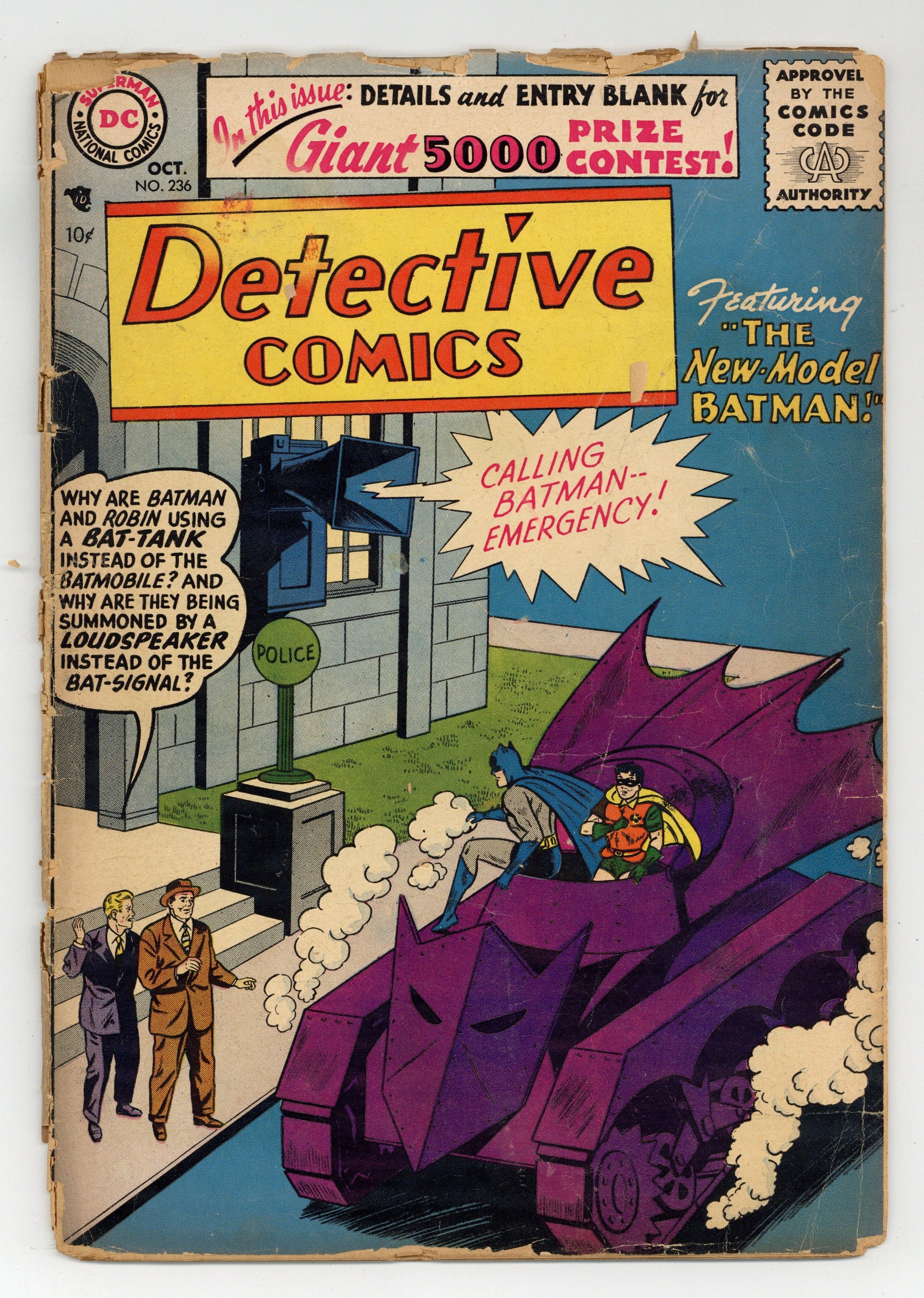Cover art by Sheldon Moldoff. 1st appearance of the Bat-Tank in The New-Model Batman starring Batman and Robin. How to Spend a Summer Week! starring Binky, script by Jack Schiff, art by Win Mortimer. The Great Earth-Mars Mystery starring John Jones Manhunter from Mars, art by Joe Certa. The Magic Tablecloth starring Roy Raymond TV Detective, script by Jack Miller, art by Ruben Moreira. 36 pgs. $0.10. Cover price $0.10.