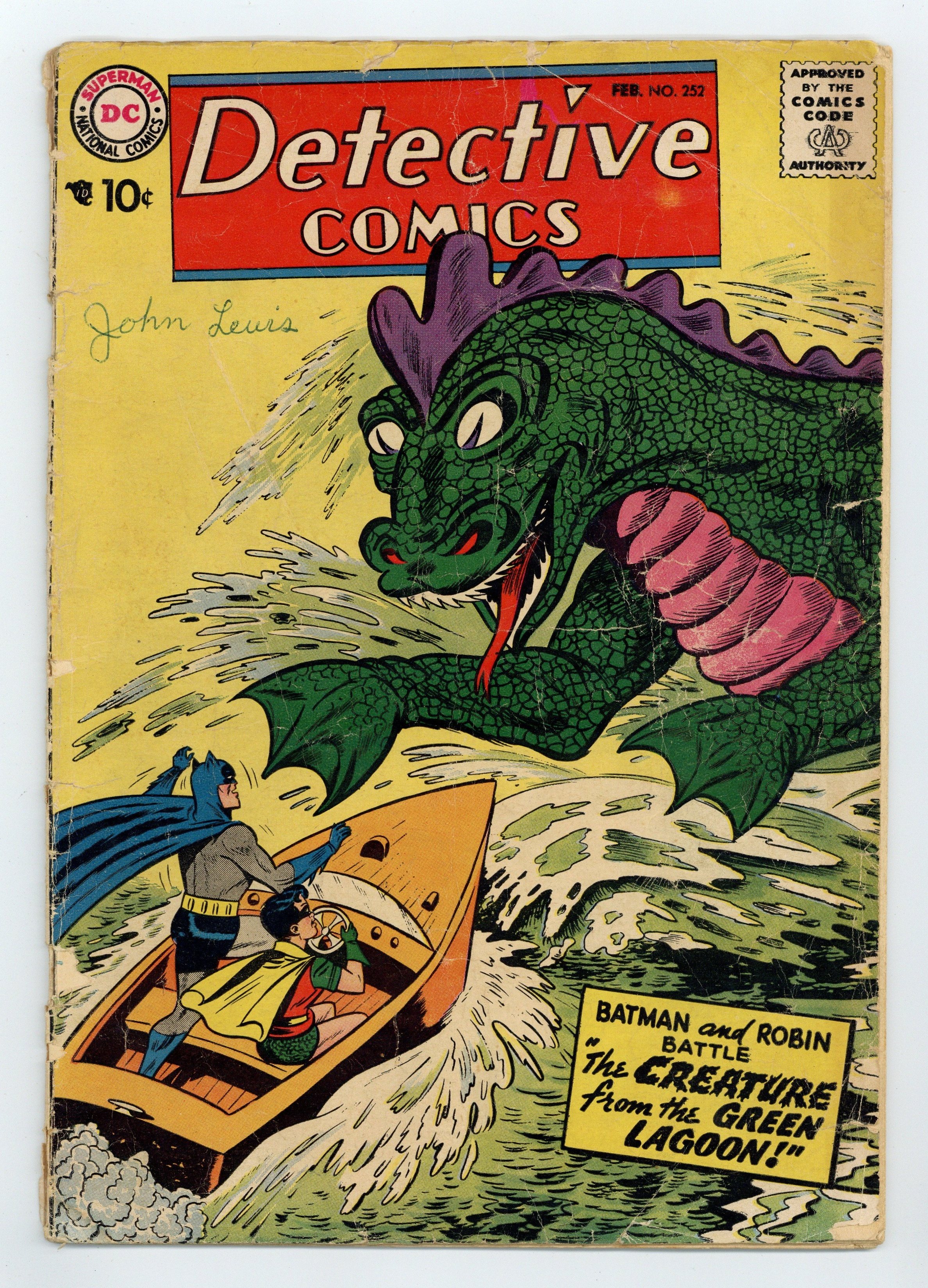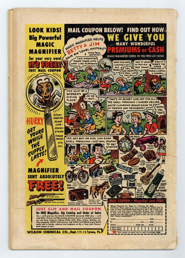 Cover art by Sheldon Moldoff. "The Creature from the Green Lagoon" starring Batman and Robin, script by Dave Wood, pencils by Sheldon Moldoff (as Bob Kane), inks by Charles Paris; A film producer friend of Batman's on Skull Island sends for the Dynamic Duo and shows them a set he has built for a movie in production...a wall to keep out a creature that is wrecking his production equipment and preventing the movie from being completed for some unknown reason. "The Menace of the Super Weapons" starring John Jones Manhunter from Mars, script by Jack Miller, art by Joe Certa; Manunter is helpless to stop Waldo Wilson's super weapons. "Danger Trail" text story. Warden Willis two-pager by Henry Boltinoff. "The Undersea City" starring Roy Raymond TV Detective, art by Ruben Moreira; Roy encounters Horace Wakely. 36 pgs., full color. Cover price $0.10.