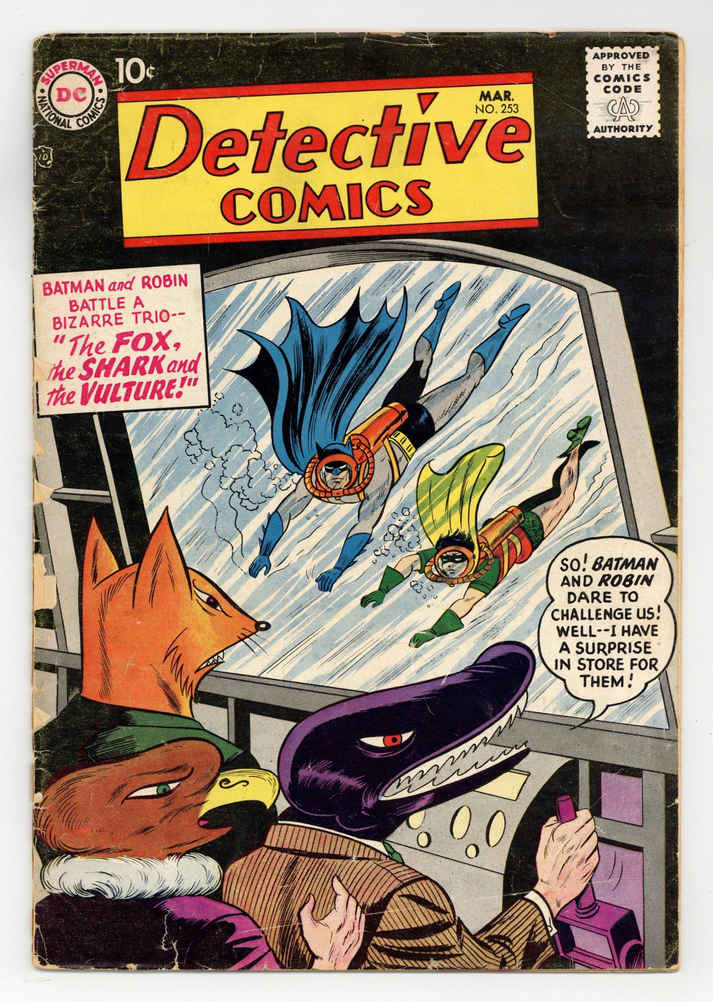 1st Appearance of the Terrible Trio. Cover art by Sheldon Moldoff. "The Fox, the Shark, and the Vulture" starring Batman and Robin, script by Dave Wood, pencils by Sheldon Moldoff (as Bob Kane), inks by Charles Paris; A weird trio hijacks artifacts from a world tour of historical artifacts exhibit. A sharp witted Batman figures out the trio's lair and overcomes them. Casey the Cop humor page by Henry Boltinoff. Do You Know What's Behind a Law? public service announcement, art by Bob Brown. "The Fossil Man" starring Roy Raymond TV Detective, art by Ruben Moreira; Roy vs. Thor Dakar. Warden Willis two-pager by Henry Boltinoff. Bureau of Destroyed Money text article. "The Super Reporter!" starring John Jones Manhunter from Mars, script by Jack Miller, art by Joe Certa; Gangster Harry Moran starts his own paper in order to drive legitimate papers off the newsstands. 36 pgs., full color. Cover price $0.10.
