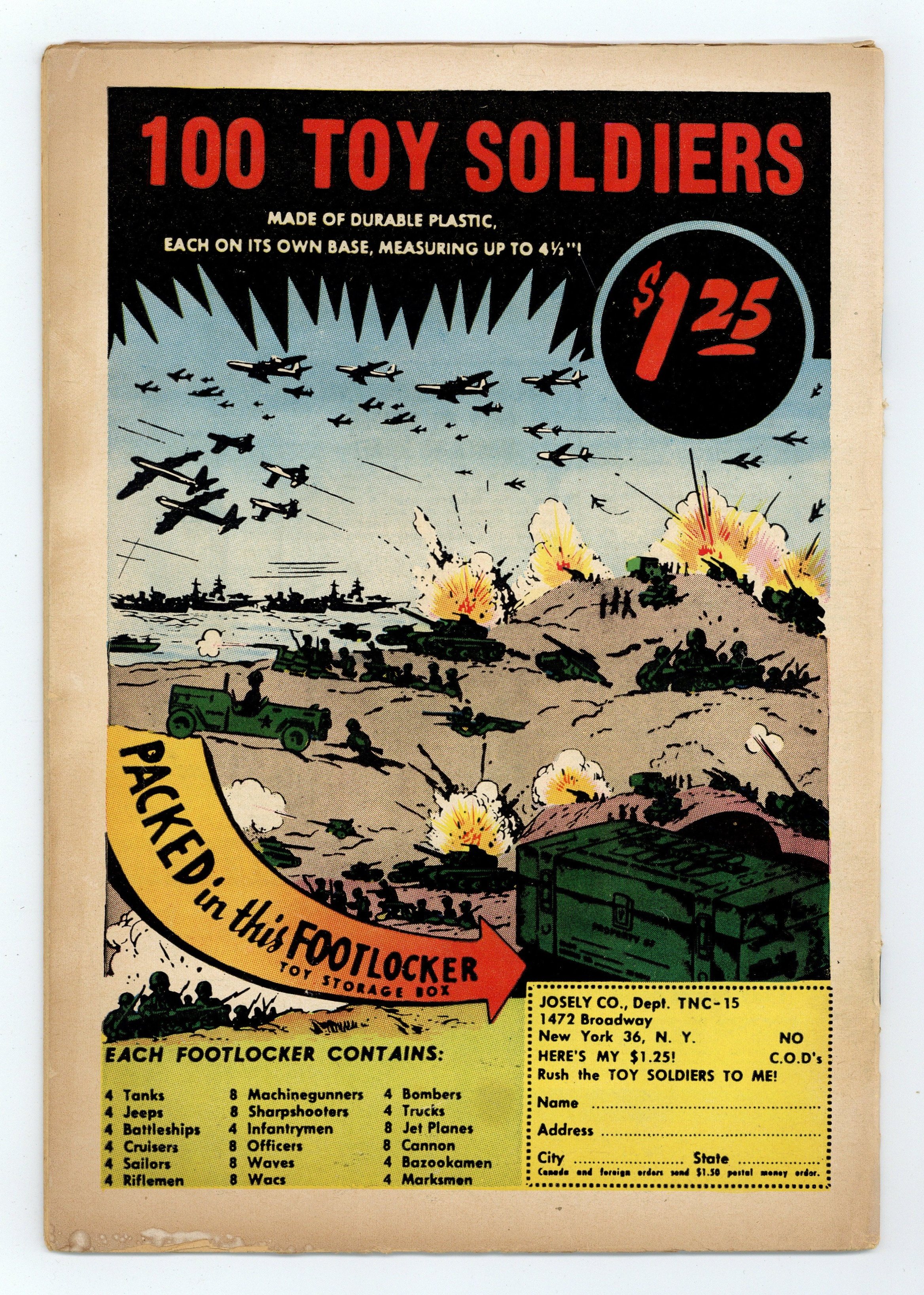 Cover by Joe Kubert. Written by Bob Haney and Bill Finger. Art by Russ Heath, Mort Drucker and Jack Abel. In this issue: "The Big Run!" by Bob Haney and Russ Heath; "A Hatful of War!" by Haney and Mort Drucker; "You've Got to Go Out!" by Haney and Jack Abel; "The Flying Mine!" by Bill Finger and Heath; and half-pager "Ready to Strike!" 36 Pages, Full Color. Cover price $0.10.