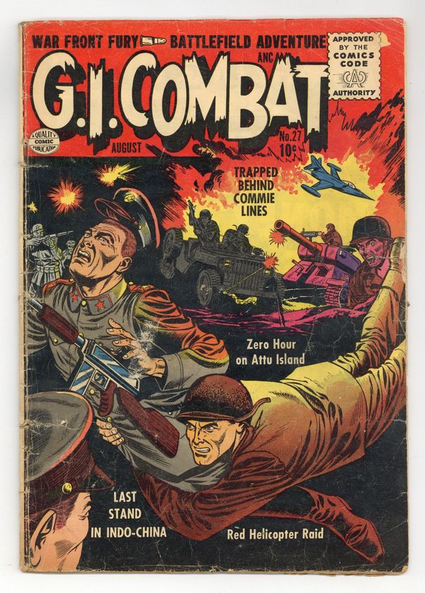 Cover by Dick Dillin? and Chuck Cuidera. Written by unknown. Art by Charles Nicholas and unknown. War front fury! Battlefield adventure! In this issue: "Last Stand in Indochina," with pencils by Charles Nicholas; "Red Helicopter Raid"; "Trapped Behind Commie Lines," with pencils by Nicholas; 1-page text story "Vengeance!"; and "Zero Hour on Attu Island"! 36 Pages, Full Color. Cover price $0.10.