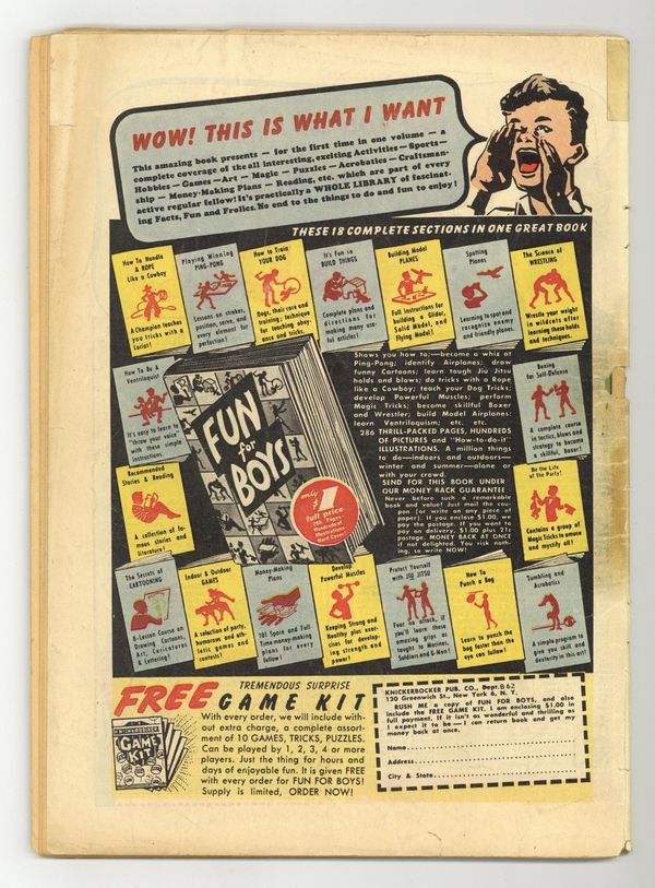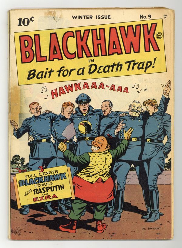 Cover art by Al Bryant. Bait For A Death Trap; Blackhawk crashlands in Burma; Olaf and Andre go in to rescue him; But Burma Jack gets there first and wants to sell Blackhawk to the Japanese. Where In The World...?????; The Blackhawks raid Reri Atoll and find burnt remnants of a secret Japanese plan to evacuate the Phillipines using a floating island! The Super-Spies of the Rising Sun, art by Al Bryant; The Japanese use science to turn change of their soldiers to look completely like Caucasian Americans and then send them to infiltrate the Blackhawks. Rasputin and the Empress, art by Ernie Hart. Ezra Joins the Whiz-Cats, script and art by Harry Sahle. 60 Pages, Full Color. Cover price $0.10.