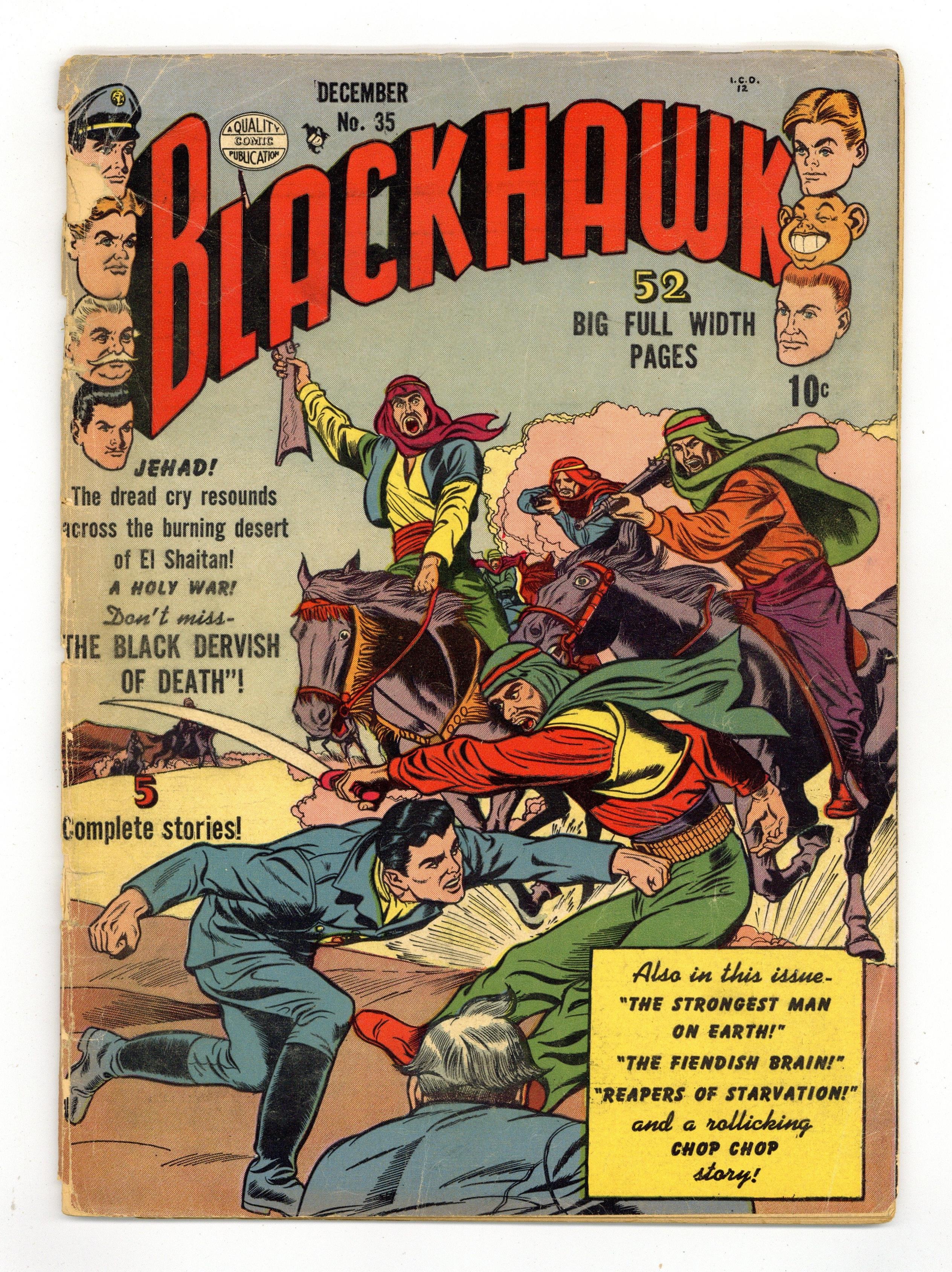 Jehad! The dread cry resounds across the burning desert of El Shaitan! Featuring: 11 page Blackhawk story "The Black Dervish of Death" pencilled by Reed Crandall (?); 12 page Blackhawk story "The Strongest Man On Earth" pencilled by Bill Ward; 9 page Blackhawk story "The Reapers of Starvation" drawn by Bill Quackenbush (?); 5 page Chop Chop story "How To Be Fierce and Masterful" drawn by Bill Ward; 2 page text story "Evil Challenge"; 8 page Blackhawk story "The Story of the Fiendish Brain" drawn by Bill Quackenbush (?). Cover by Bill Ward (?). 52 Pages, Full Color. Cover price $0.10.