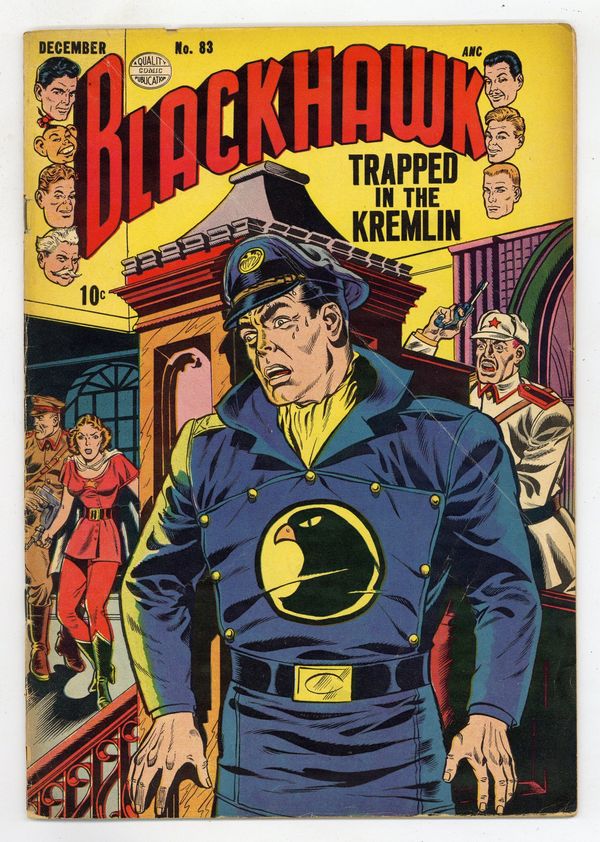 Cover by Dick Dillin and Chuck Cuidera. Stories by Dick Wood, Paul Gustavson and unknown. Art by Dick Dillin, Paul Gustavson and Chuck Cuidera. Featuring Blackhawk in: "Hammer and Sickle" by Dick Wood, Dick Dillin and Chuck Cuidera; "Trapped In the Kremlin" by Wood, Dillin and Cuidera; and "The Magnetic Mountain" with art by Dillin and Cuidera. Plus: Chop Chop in an untitled back-up story by Paul Gustavson, reprinted from issue #53. And: 1-page text story "Amateur Red Killer"! 36 Pages, Full Color. Cover price $0.10.