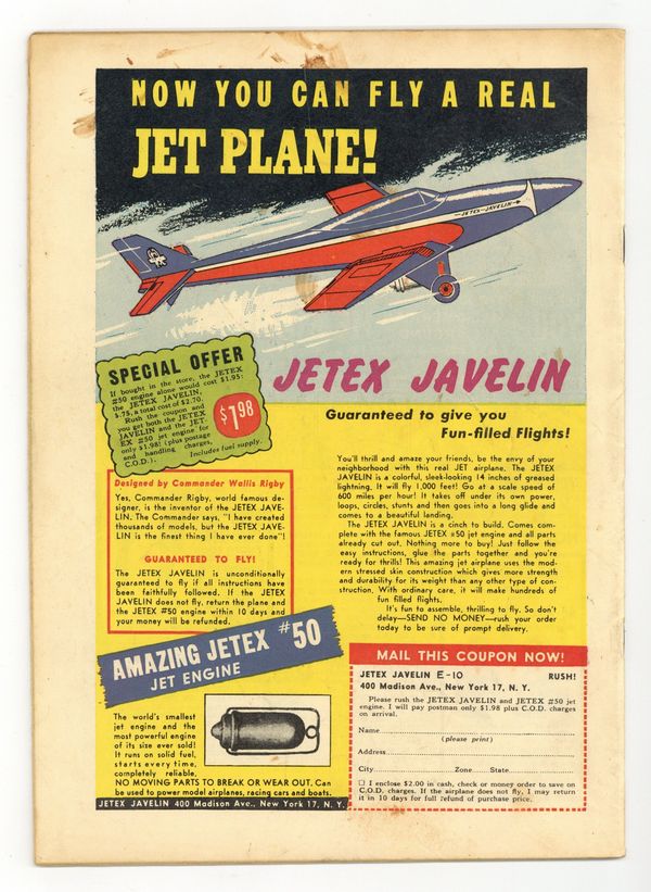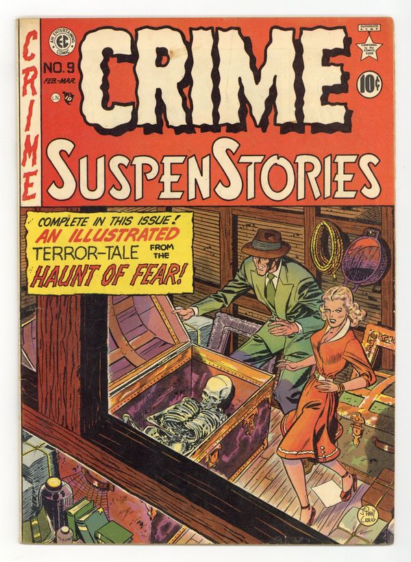Cover by Johnny Craig. Stories by Bill Gaines, Al Feldstein and Johnny Craig. Art by Johnny Craig, Jack Kamen, Graham Ingels, and Jack Davis. EC's New Trend crime title featured top-notch art and writing, barrier-pushing graphics and pre-Code violence. A couple finds an old trunk in the attic of their new home, but curiosity turns to horror when it contains human bones. A movie stand-in plots to permanently replace a famous film star. Land developers in Borneo discover gold-roofed temples, hollow trees used as coffins, and a curse that links the two together for the greedy. Also, The EC "Artist of the Issue," featuring Johnny Craig. Understudy to a Corpse!; Medicine!; Accident; Cut!; A Tree Grows in Borneo! 36 pages, Full Color. Cover price $0.10.