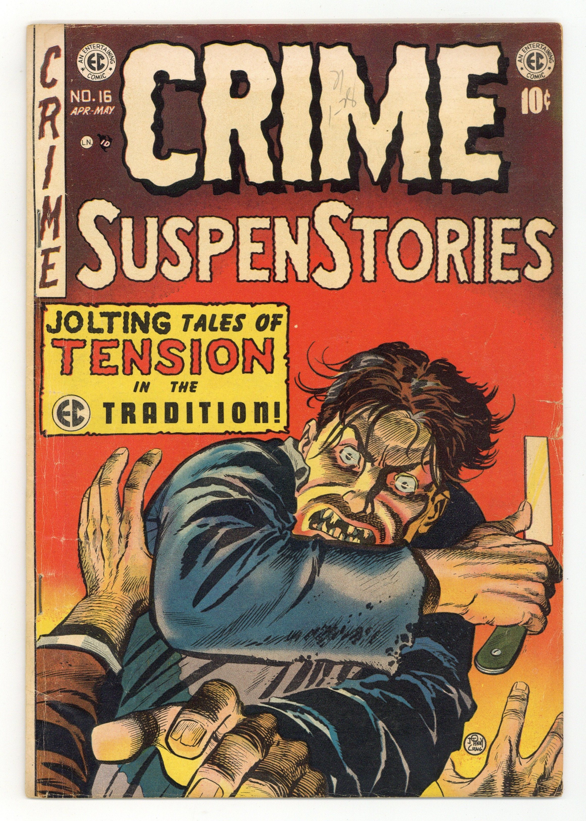 Cover art by Johnny Craig. "Rendezvous!", script and art by Johnny Craig; Joe and his office companions are taking bets that Charlie will have an airplane accident...just as a lark; Then, when Joe's boss suspects that the company's books are being juggled, Joe devises a plan to make sure his boss will have a plane accident himself. "Fission Bait!", script by Albert B. Feldstein, art by Jack Kamen; A man murders his wife to be with his mistress; He buries her in the desert, but a prospector accidentally finds the body with a Geiger counter. It turns out her watch had a radium dial! "Scorpion" text story by Albert B. Feldstein. "Come Clean!", script by Albert B. Feldstein, pencils by Al Williamson, inks by Angelo Torres; Ralph Jones has been found guilty of strangling his girlfriend and is strapped in the electric chair facing a horrible death, all for a crime he didn't commit but in which circumstantial evidence led to his conviction. "Who's Next?", script by Albert B. Feldstein, art by Joe Orlando; A barber's wife and a regular customer are having an affair; When the barber finds out, he decides the customer needs a REALLY close shave. 36 pgs., full color. Cover price $0.10.
