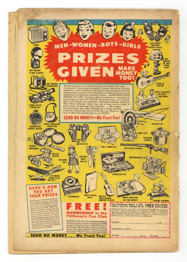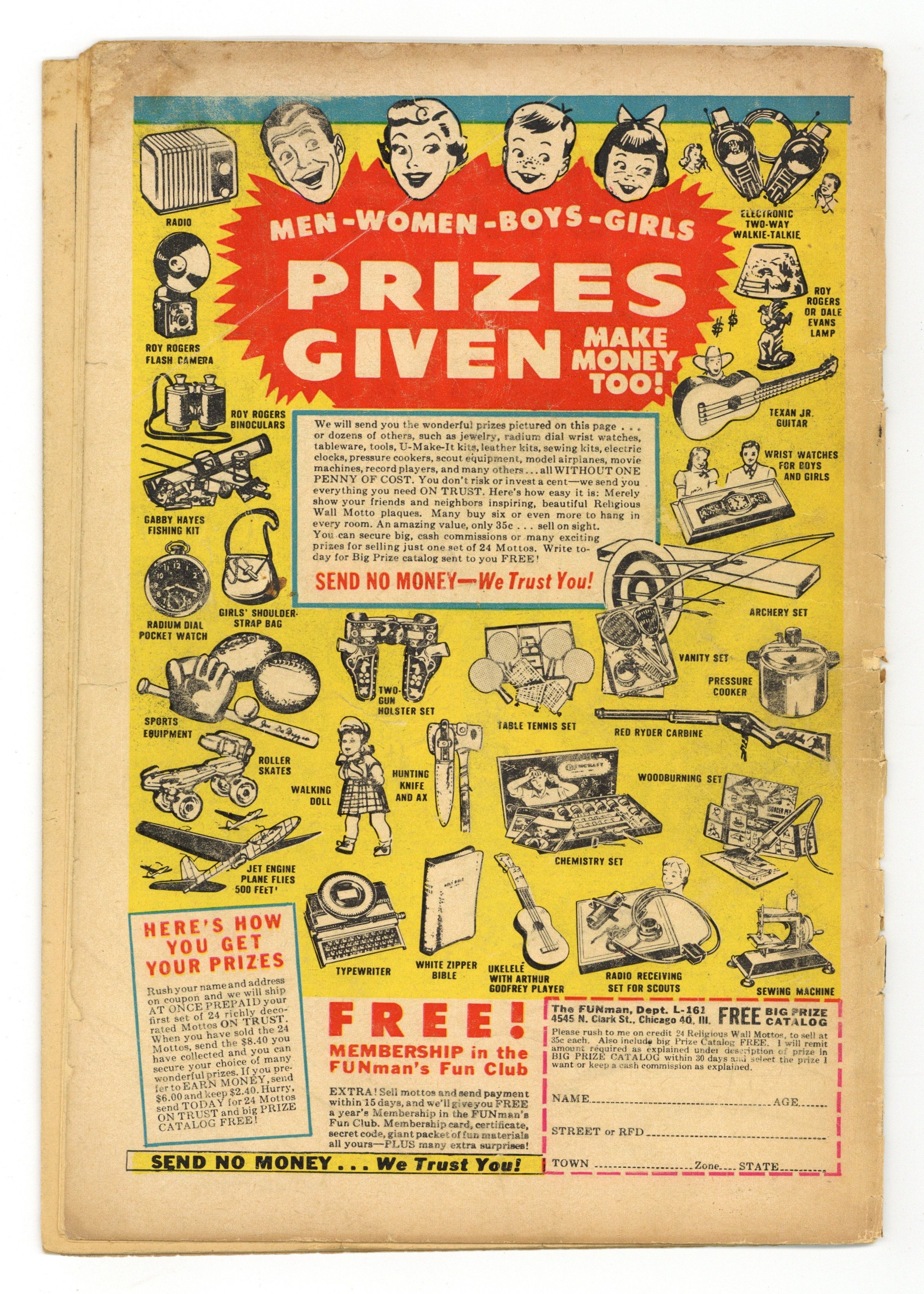 Cover by Jack Kamen. Stories by Carl Wessler and Al Feldstein. Art by George Evans, Bernie Krigstein, Marie Severin, Jack Kamen, and Graham Ingels. EC's New Trend crime title featured top-notch art and writing, barrier-pushing graphics and pre-Code violence. The new town librarian is murderously obsessed with the idea that she may be the next victim of a serial killer on the loose. A tense standoff with a gunman in a diner can be resolved if a state trooper just makes his regular daily visit on time. A man denies that his son could be bad, until the police show up at his house looking for a killer. Plus "In Memoriam," a note to readers about the cancellation of Crime Suspenstories and EC's future plans. Also, A Collector's E.C. Check-List, giving the issue numbers and dates of EC New Trend titles. Maniac at Large; Just Her Speed; Horror Hobby; Where Theres Smokeā¦; Good Boy. Final issue of the series. 36 pages, Full Color. Cover price $0.10.