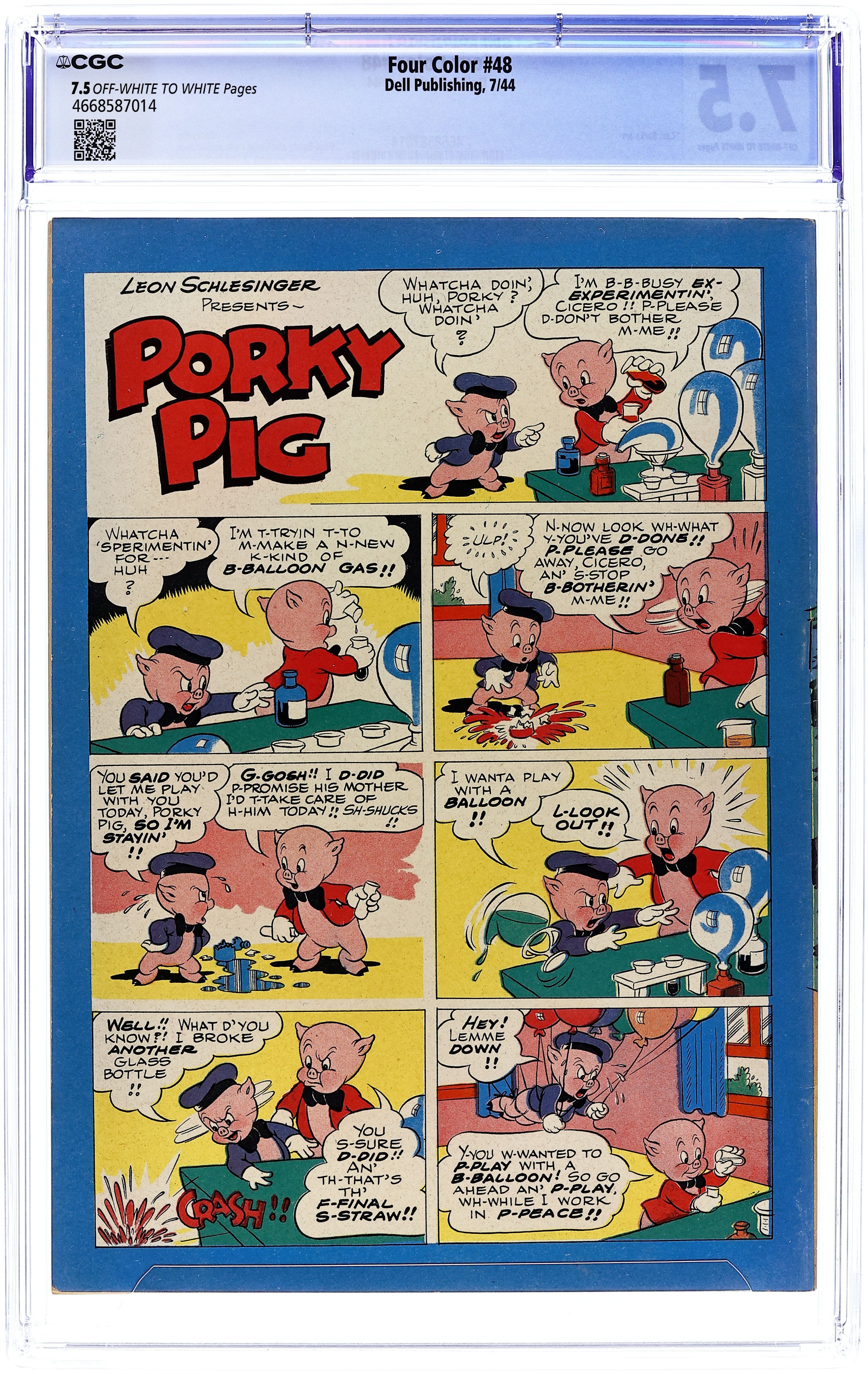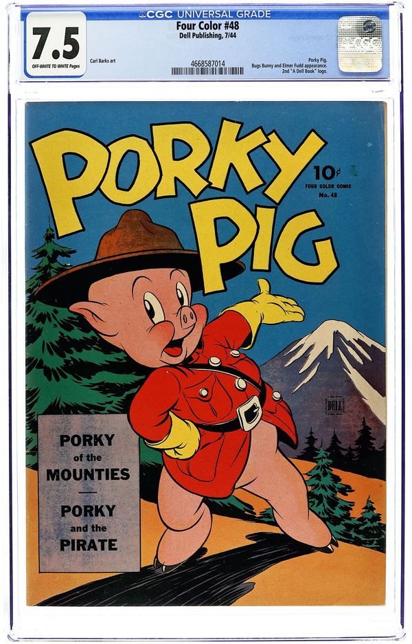 Stories by unknown. Art by Carl Barks and various. Featuring the tales "Porky of the Mounties" and "Porky and the Pirate," plus additional stories on the inside front and inside back covers, as well as the back cover. Starring Porky Pig, Petunia Pig, Bugs Bunny, Uncle Ham, Dauntless, Pierre (villain), Captain Blackheart, Captain Wimple (villain), Ratsy (villain), Sniffles, Beaky Buzzard and Cicero Pig! 52 pages, full color. Cover price $0.10.