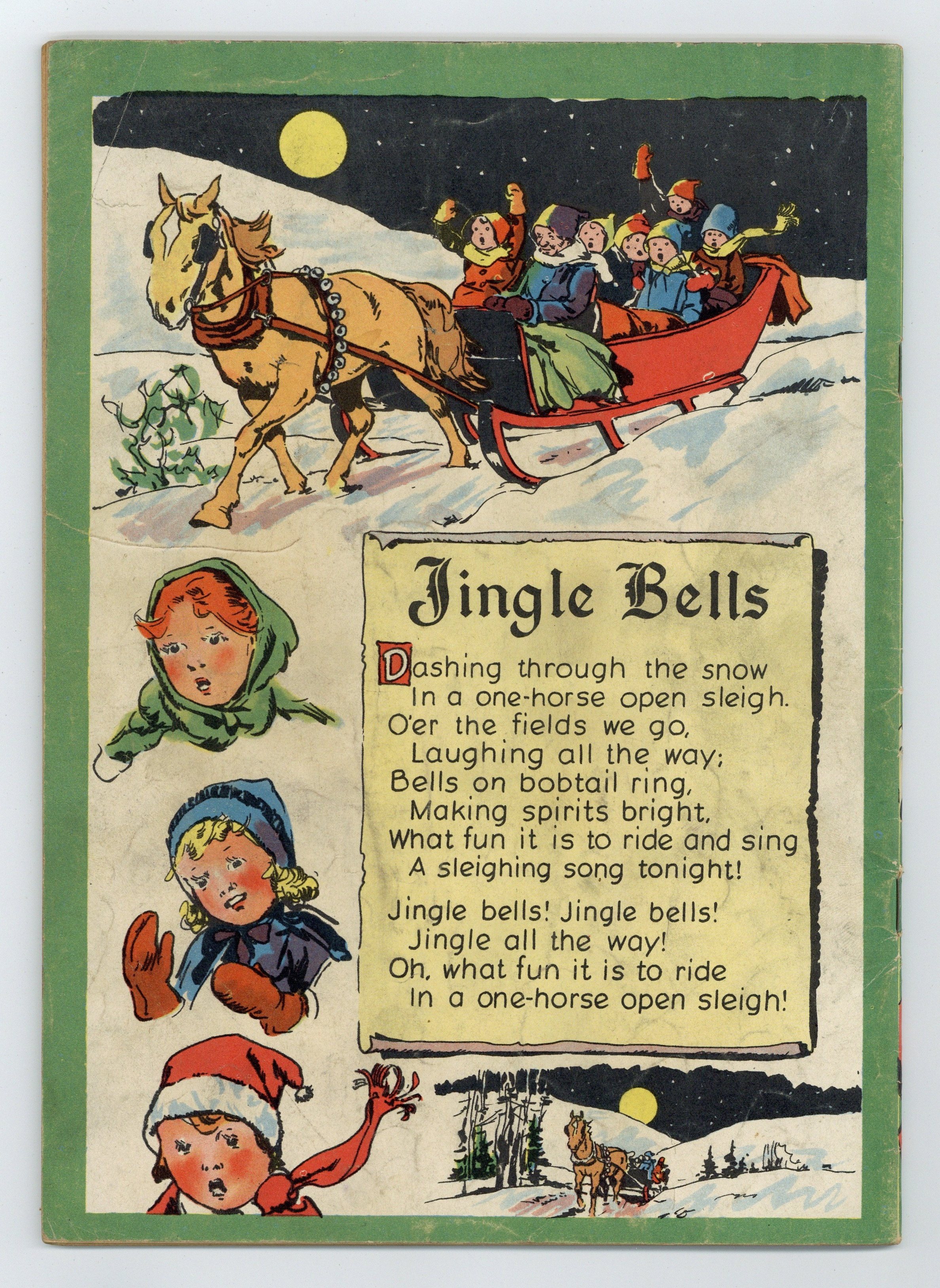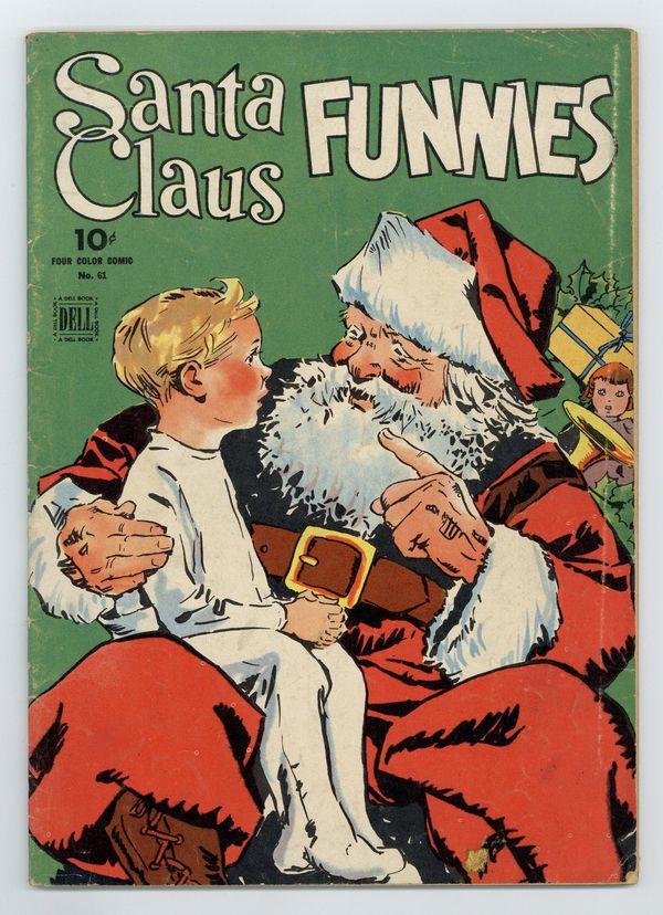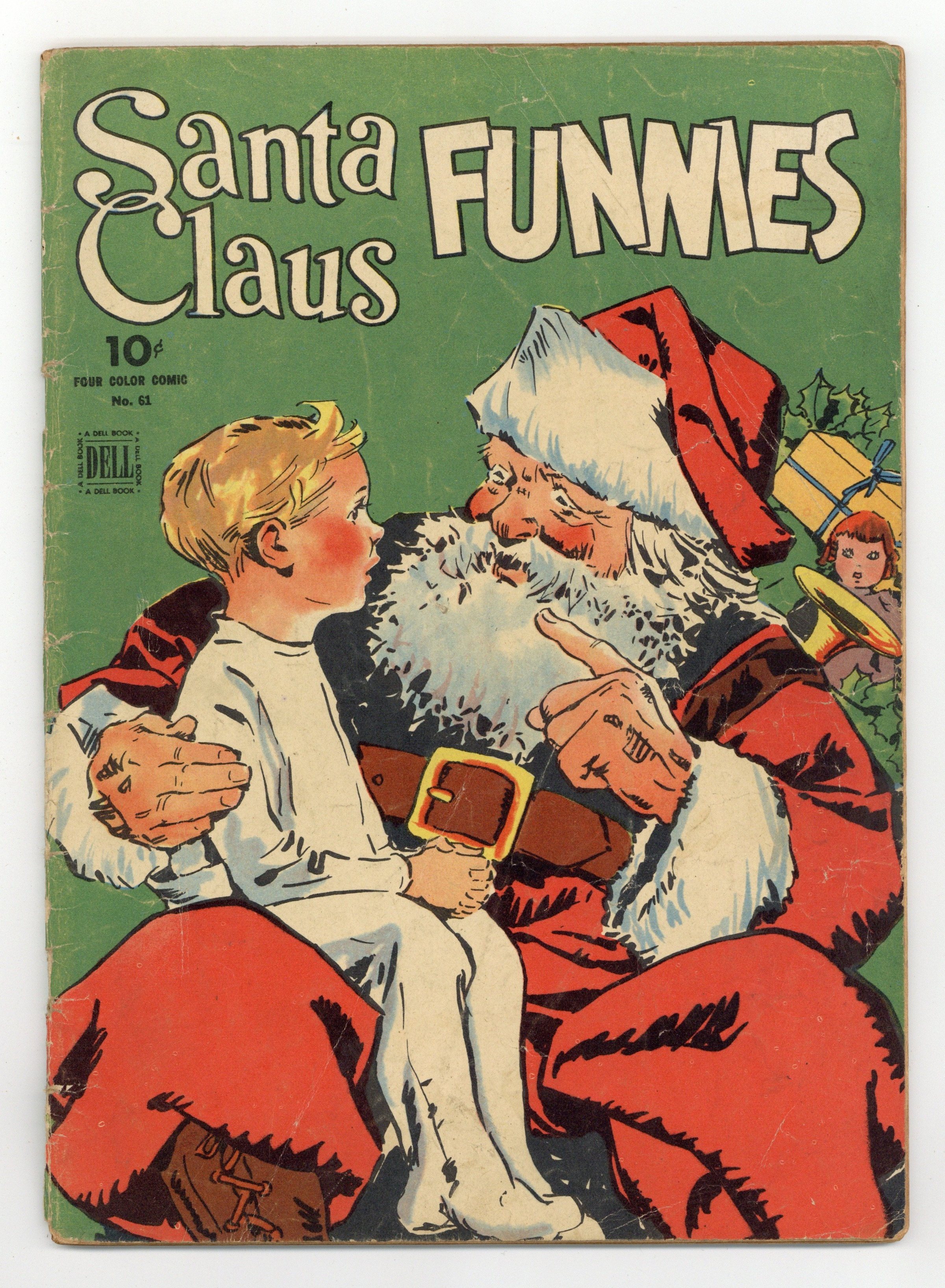 Indicia title is "SANTA CLAUS FUNNIES, No. 61." Cover art by Arthur E. Jameson. How Santa Got His Red Suit, script and art by Walt Kelly; Years ago, Santa did not always wear a red suit; One Christmas eve, Jack Frost steals his sleigh and toys and leaves Santa stranded; He finds refuge at a tiny house full of elves. The Night Before Christmas, script by Clement Clark Moore, art by Arthur E. Jameson; The poem "A Visit from St. Nicholas." Miracle in the Wildwood, script by Gaylord Du Bois, art by Arthur E. Jameson; Two quarrelsome knights divide the village of Benn in half; As time goes by the village falls away from the Christian religion and becomes a cruel, violent place. 52 pages, full color. Cover price $0.10.