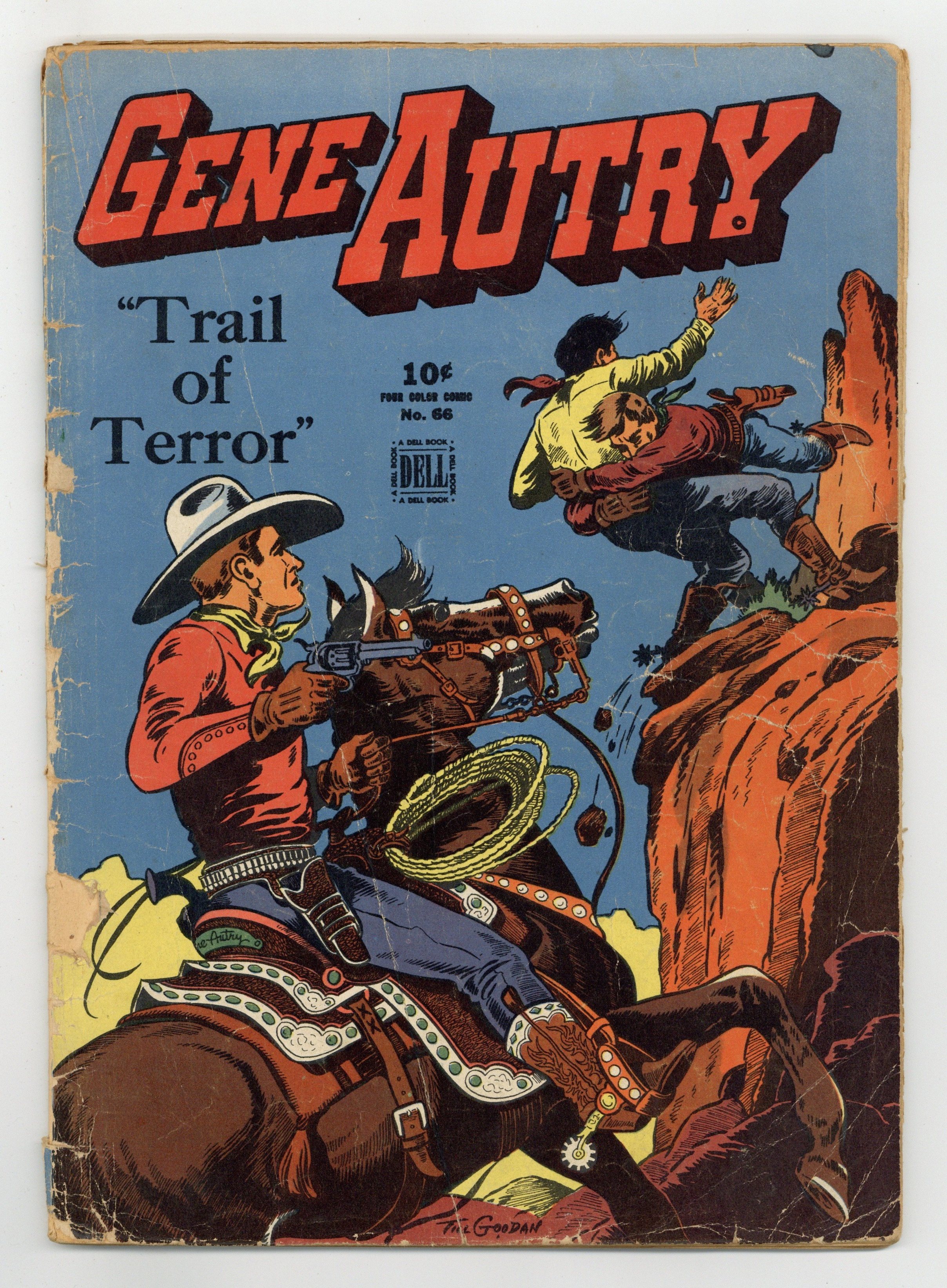 Indicia title is "GENE AUTRY, TRAIL OF TERROR, No. 66." Cover art by Till Goodan. Gene Autry and the Trail of Terror, art by Jesse Marsh; The Sheriff of Burrtown calls in Gene Autry to help him stop the outlaw James Black, alias the Black Hawk, who has terrorized three states. Gene Autry and the Firebug; Gene Autry goes to Peaceful Mesa to visit his friend Pappy Hicks, the sheriff; On the way he finds a dead man and is accused of being his killer; When Gene gets to Peaceful Mesa, he has to avoid a lynch mob and then has to find out who has been setting a series of fires in the town. 52 pages, full color. Cover price $0.10.