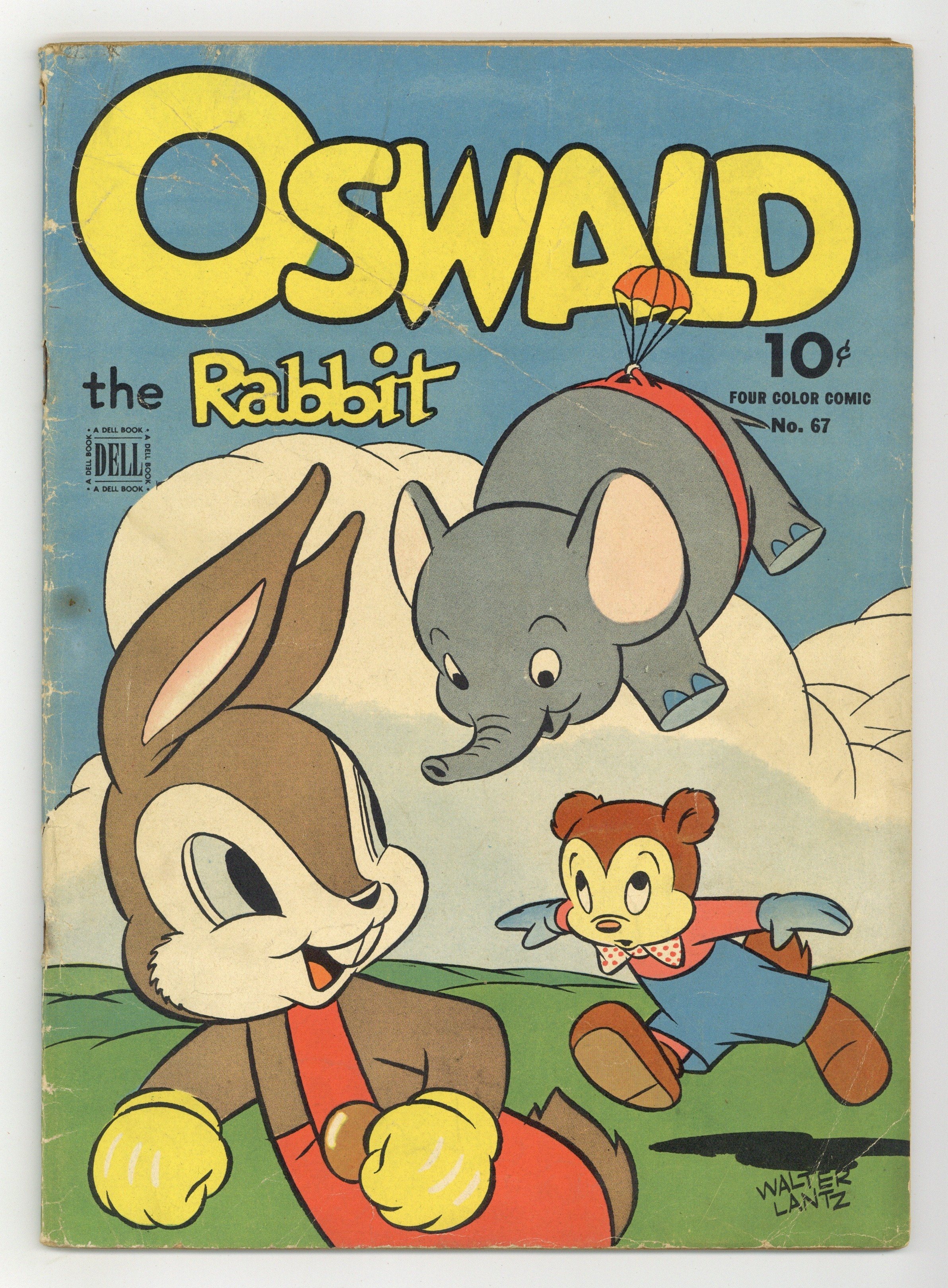 $22.50Indicia title is "OSWALD THE RABBIT, No. 67." Cover art by Dan Gormley. Untitled Oswald the Rabbit story, script by John Stanley, art by Lloyd White; Oswald and Toby fall into a deep hole at the top of a mountain and end up in a strange land; Oswald and Toby are jailed when Toby accidentally picks the last flower in the kingdom. The Secret Six, script by John Stanley, art by Lloyd White; D. J. Rarebit, the president of a large company, is threatened by "The Secret Six"; He hires Oswald to impersonate him in hopes that the gang will "knock off" Oswald and think it was him. 52 pages, full color. Cover price $0.10.
