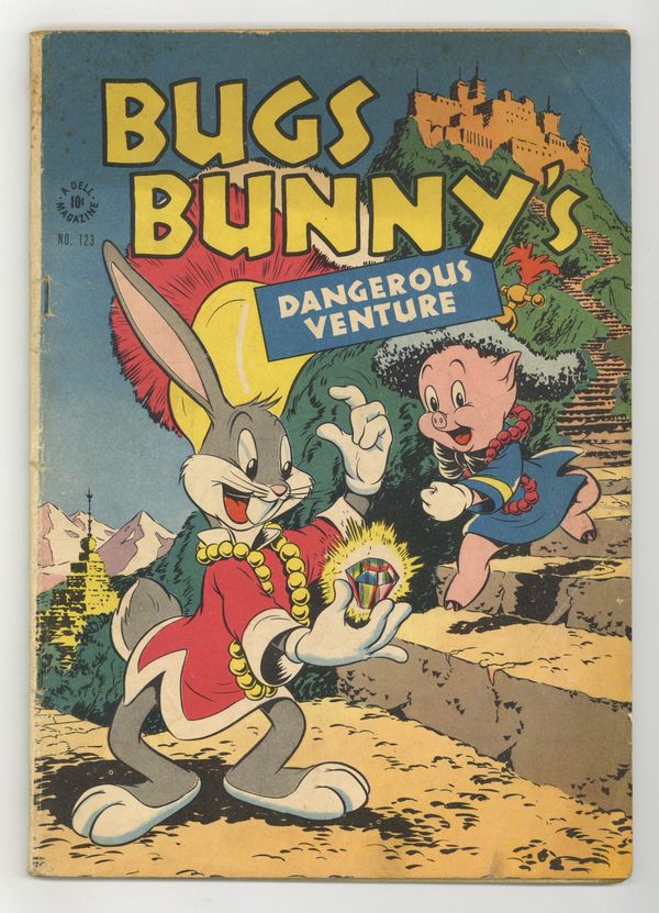 Indicia title is "BUG'S BUNNY'S DANGEROUS VENTURE, No. 123". Cover art by Tom McKimson. Bugs Bunny's Dangerous Venture, art by Tom McKimson; Bugs, Porky, and Beaky start their own messenger service; A mysterious stranger wants them to deliver a package to Omi-Akin-Bak at the Ritzmore Hotel; Bugs and Porky take the package to the hotel, only to find that Omi-Akin-Bak has checked out and returned to his home in Shangreet-Lo in the Forbidden Mountains of Tibet; Using Beaky's money, Bugs and Porky set out to deliver the package to Shangreet-Lo. Experiment 74-X, art by Carl Buettner; Bugs and Elmer are captured by deranged Prof. Lizer and his henchman Grubney after they see the professor use a strange machine to enlarge plants to giant-size; The Professor then uses a different machine to shrink Bugs and Elmer to ant-size. 52 pages, full color. Cover price $0.10.
