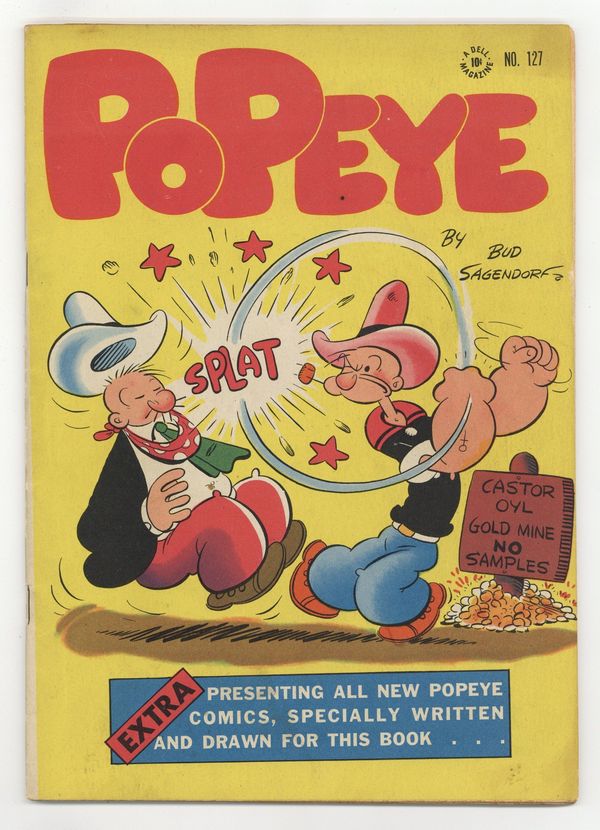 Indicia title is "POPEYE, No. 127". Cover art by Bud Sagendorf. My Kingdom For a Horsh or It's Too Far To Walk!; Olive's brother Castor has discovered gold and Olive and Wimpy go west to visit him; Popeye follows, only to find that Olive has become engaged to Bad Bull Battle, owner of 50 gold mines. Two-To-One" or Fifty Thousand Bucks Fer Two!; Popeye is tricked into a boxing match with a small man named "Little Jim" and his huge brother "Big Jim" and has to fight both at the same time. Scripts and art by Bud Sagendorf. 52 pages, full color. Cover price $0.10.