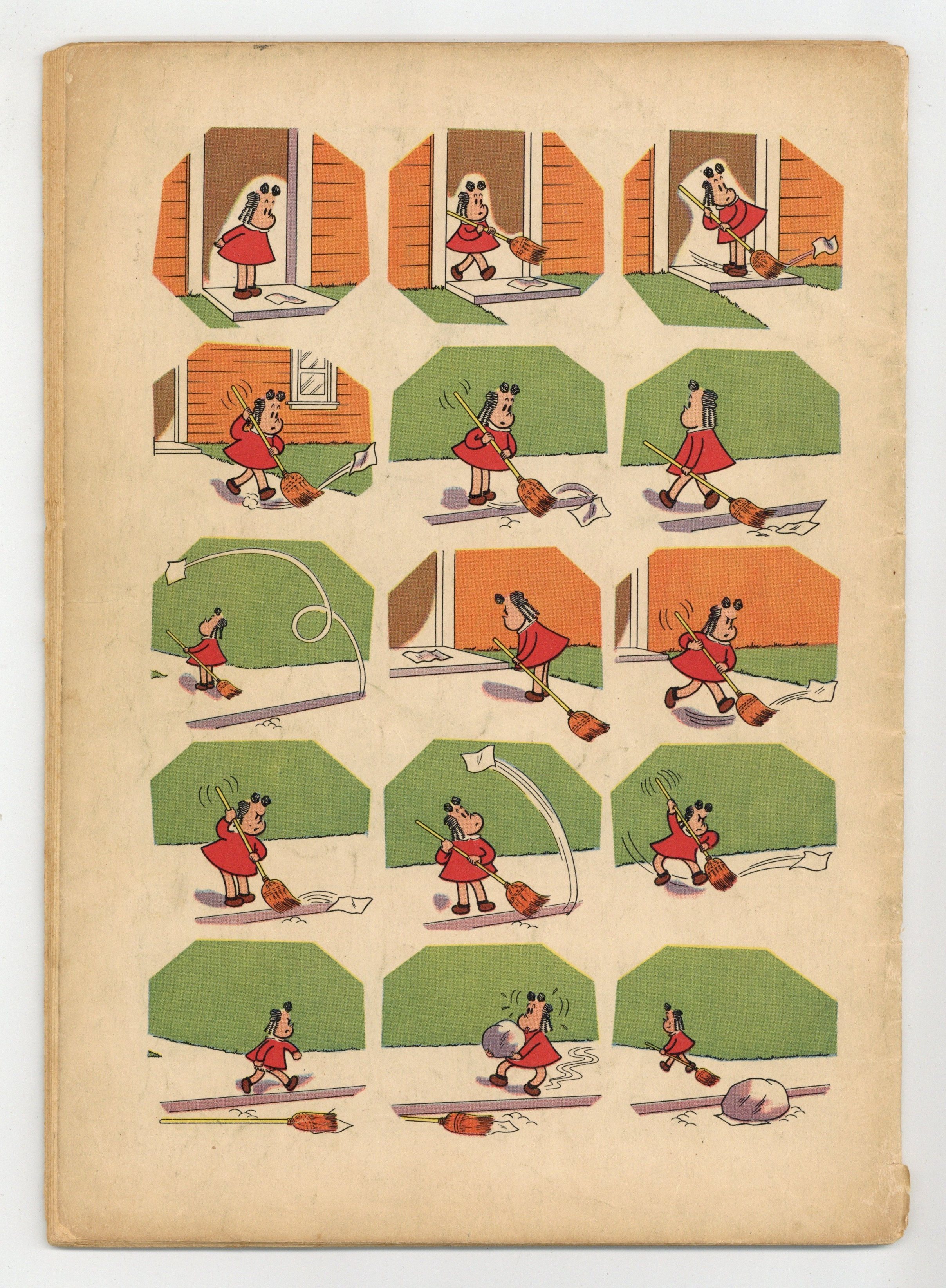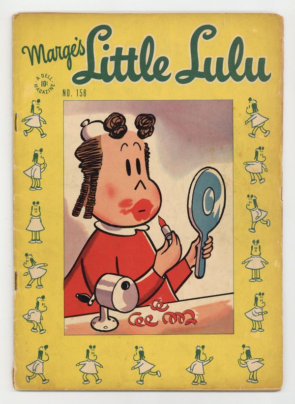 Indicia title is "MARGE'S LITTLE LULU, No. 158." Little Lulu for President; Lulu and Tubby both decide they could grow up to be President; Tubby decides to copy George Washington's mythical feat of chopping down the cherry tree. Takes the Cake; Lulu goes with Tubby to the bakery; He buys a cake, but drops it on the way home;They take the cake to Lulu's house to try to repair it. Just a Gigolo; Lulu and a new girl, Dolly, try to bribe Tubby with candy and soda so he'll notice them. Lulu's Lamp; Lulu tells Alvin a story about when she was a poor girl who worked for a shoemaker; An old man gives her a magic lamp after she gives him some shoes; The lamp has a genie that can grant her any wish--except for one thing. Scripts by John Stanley, pencils by John Stanley (layouts) and Irving Tripp, inks by Irving Tripp. 52 pages, full color. Cover price $0.10.