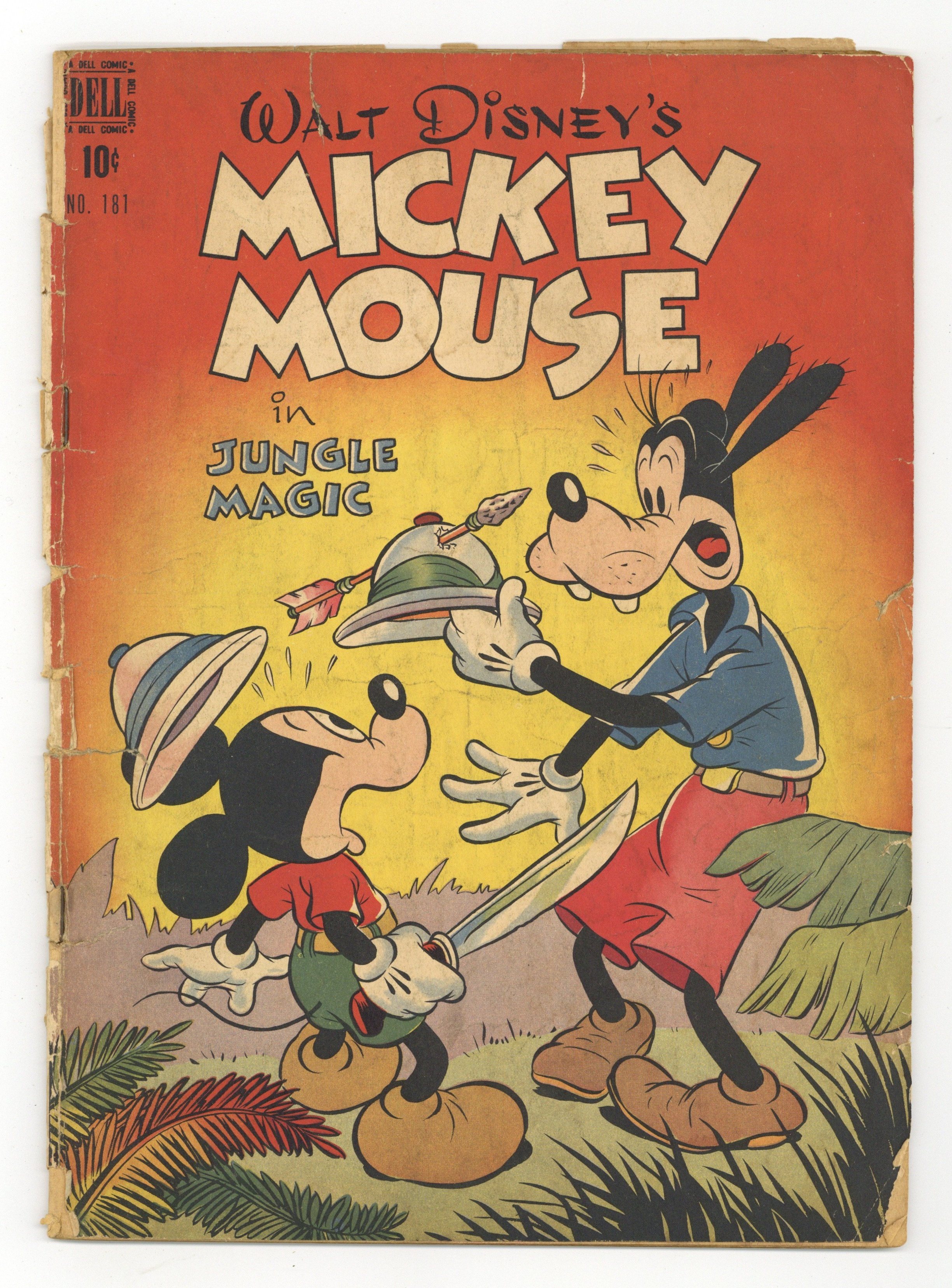 Indicia title is "WALT DISNEY'S MICKEY MOUSE in JUNGLE MAGIC, No. 181." Cover art by Bill Wright. Mickey Mouse and Jungle Magic!, script and art by Bill Wright; Mickey is working in a flower shop; A wealthy woman requests a black orchid and the store's owner sends Mickey and Goofy to the Orinoco River area in South America to find one. Mickey Mouse and the Soap Box Derby, art by Gil Turner; The nephews are so busy building a soap box racer that Mickey thinks they've forgotten his birthday. 36 pages, full color. Cover price $0.10.