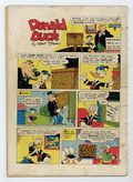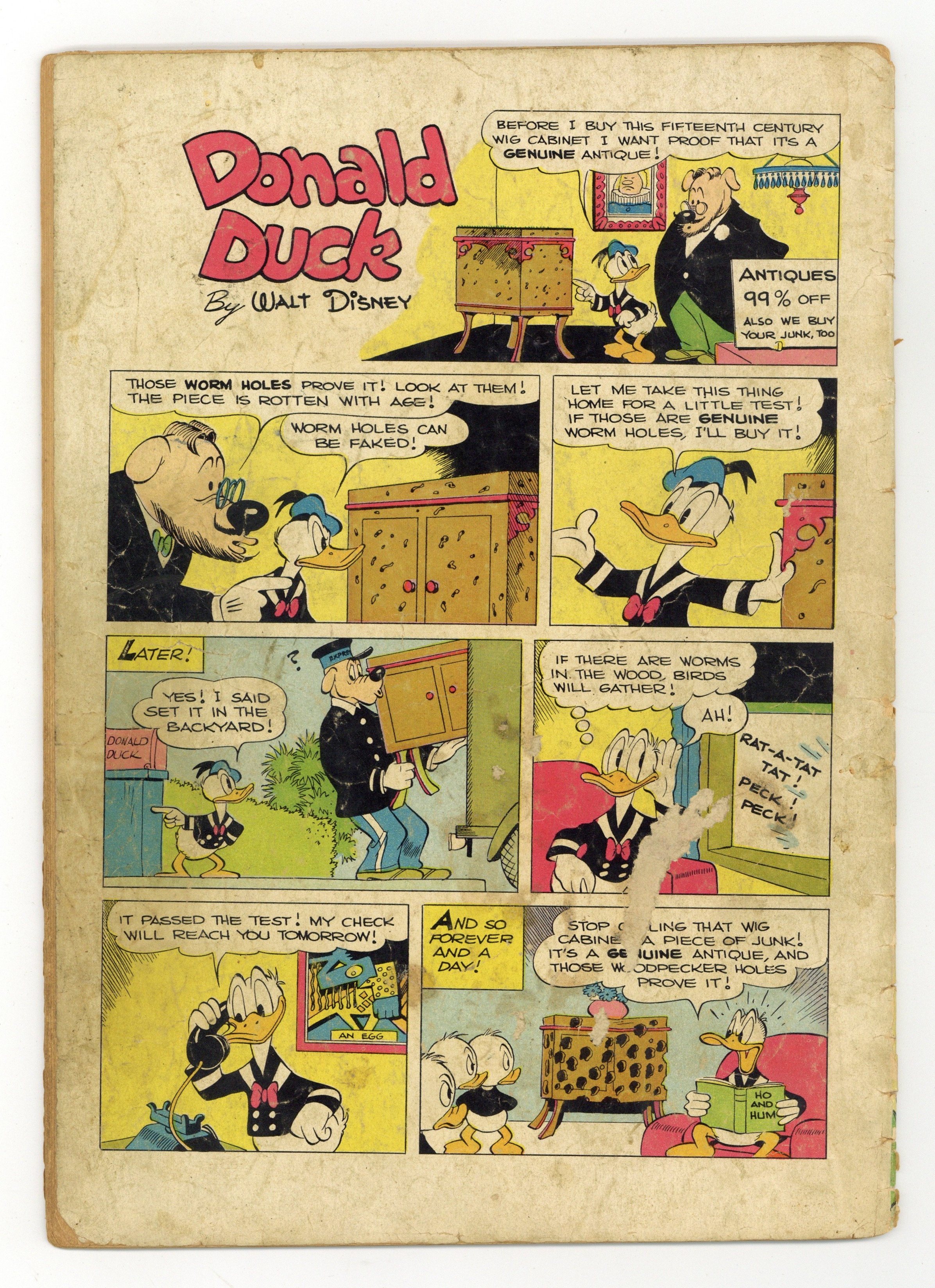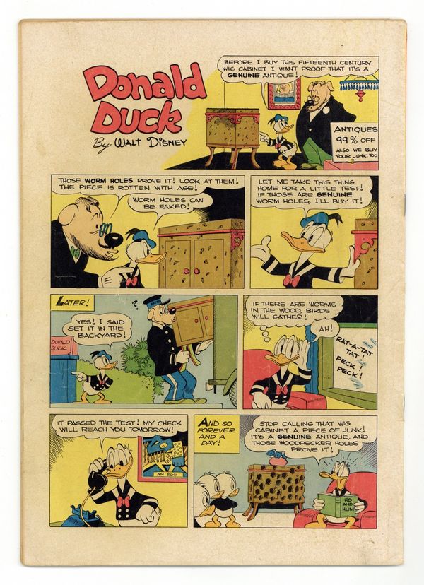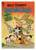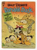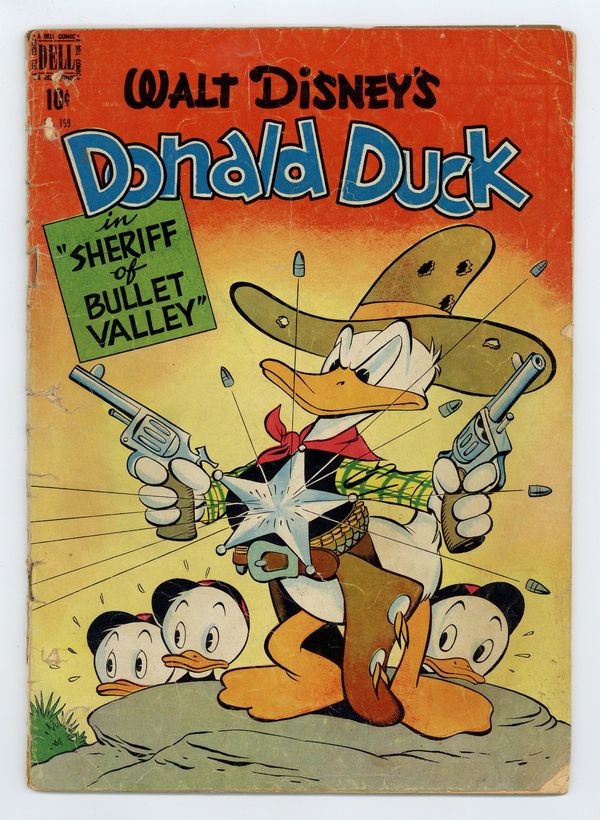 $225.00Indicia title is Walt Disney's DONALD DUCK in SHERIFF OF BULLET VALLEY, No. 199. Cover art by Carl Barks. Sheriff of Bullet Valley, script and art by Carl Barks; Donald becomes a sheriff's deputy in Bullet Valley and is sent out to bring in a gang of rustlers; The rustlers are led by Blacksnake McQuirt, a tough gunman who poses as a legitimate rancher and uses a branding ray to change brands from as far as a mile away. Best Laid Plans inside back cover strip by Carl Barks. The Genuine Article back cover strip by Carl Barks; Donald tests the authenticity of worm holes in an antique. 36 pages, full color. Cover price $0.10.