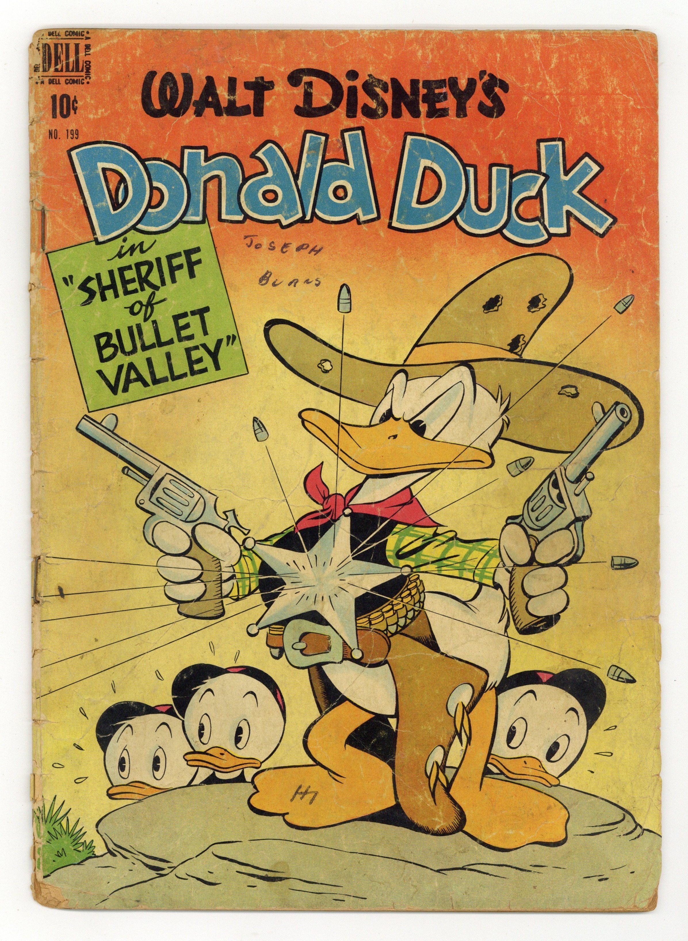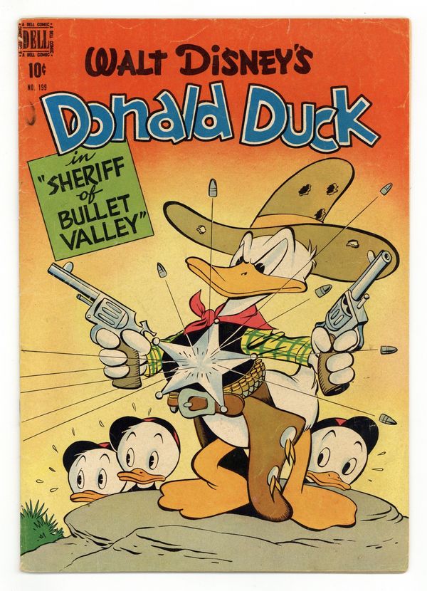 Indicia title is Walt Disney's DONALD DUCK in SHERIFF OF BULLET VALLEY, No. 199. Cover art by Carl Barks. Sheriff of Bullet Valley, script and art by Carl Barks; Donald becomes a sheriff's deputy in Bullet Valley and is sent out to bring in a gang of rustlers; The rustlers are led by Blacksnake McQuirt, a tough gunman who poses as a legitimate rancher and uses a branding ray to change brands from as far as a mile away. Best Laid Plans inside back cover strip by Carl Barks. The Genuine Article back cover strip by Carl Barks; Donald tests the authenticity of worm holes in an antique. 36 pages, full color. Cover price $0.10.