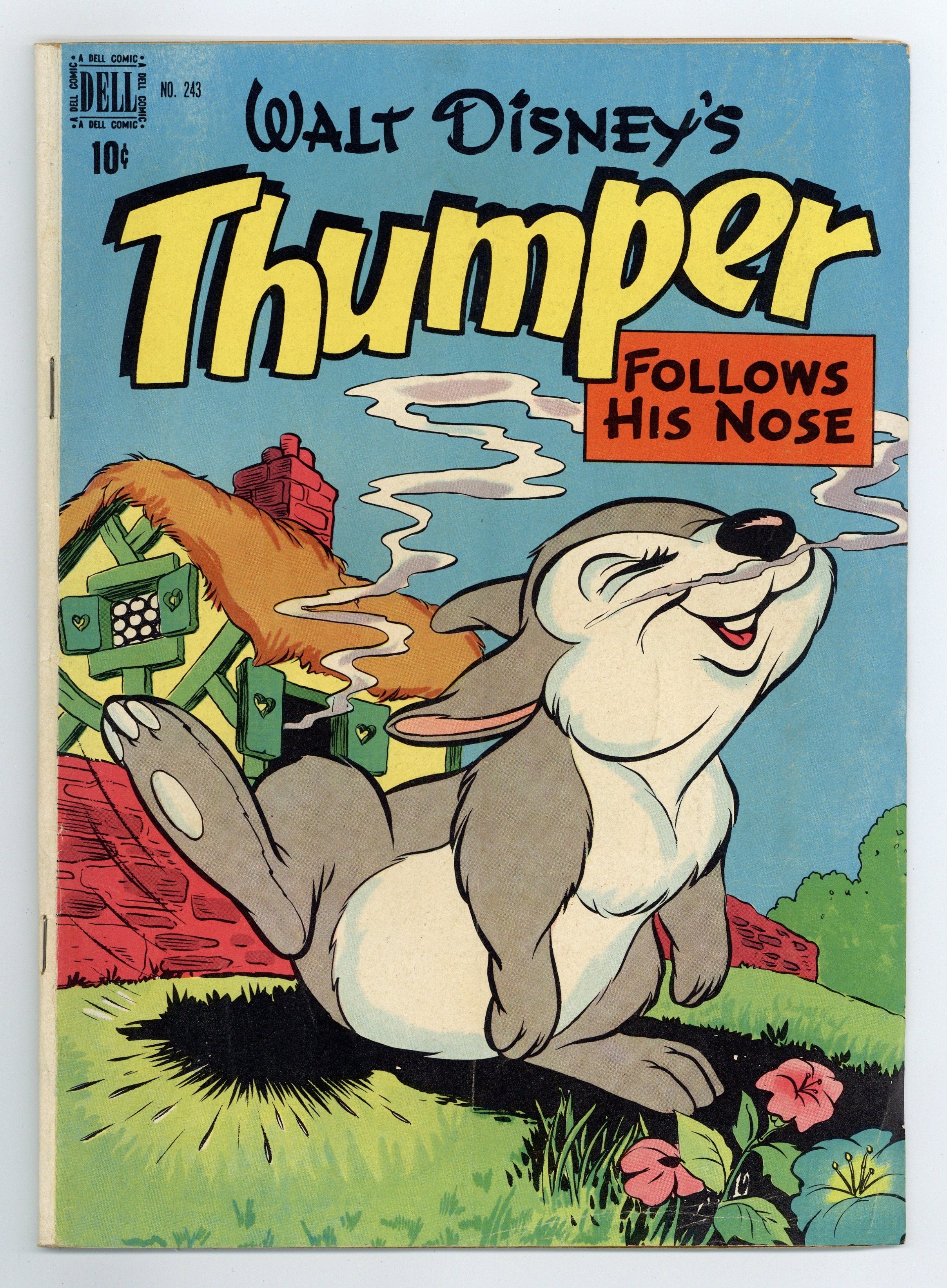 $18.25Indicia title is "Walt Disney's THUMPER FOLLOWS his NOSE, No. 243." Cover art by Carl Buettner. Thumper Follows His Nose, art by Jim Pabian; Thumper finds the Three Bears' house and tussles with his conscience about eating the porridge; He leaves the house but runs into the Big Bad Wolf. The Li'l Giant, art by Tony Strobl; Thumper is depressed when he's told he's just a little bunny; Later he learns that size is relative, when he meets Wiggly Worm, to whom Thumper is a giant. Thumper Is a Hero, art by Tony Strobl; When lumbermen and hunters threaten the forest, Thumper decides he has to do something; He puts out a fire left by careless hunters and as a reward the forest rangers declare the area a forest preserve. 36 pages, full color. Cover price $0.10.