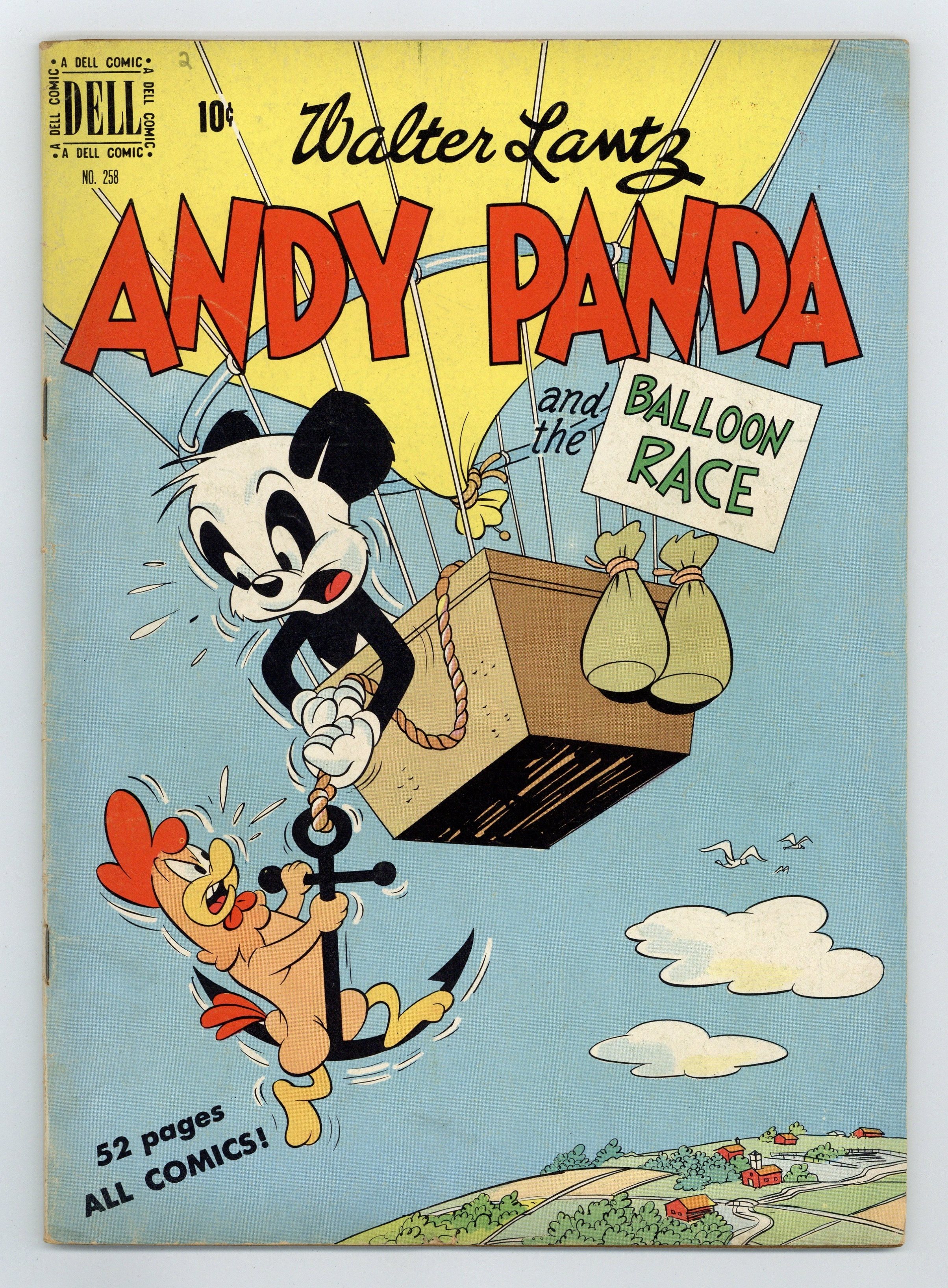 Indicia title is "Walter Lantz ANDY PANDA and the BALLOON RACE, No. 258." Cover pencils by Dick Hall. Andy Panda and The Balloon Race, pencils by Dick Hall, inks by Anahid Dinkjian; A hot air balloon lands in Andy's back yard; In its basket is Professor Gaas Bag, who has been hit over the head by his rivals in a championship long-distance balloon race; He is unable to continue, so he lets Andy and Charlie take his balloon to finish the race. 52 pages, full color. Cover price $0.10.