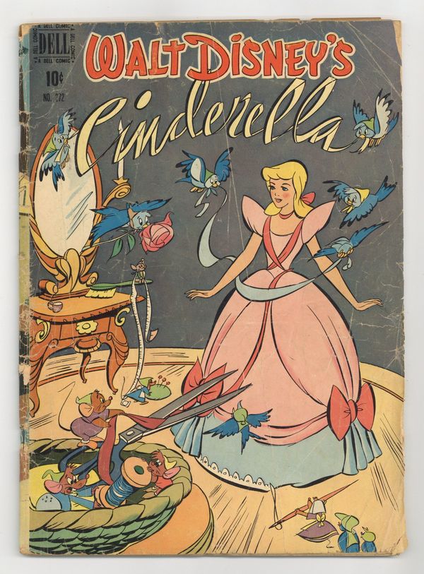 $18.00Indicia title is "Walt Disney's CINDERELLA, No. 272." Cover art by Dan Gormley. Inside front cover and inside back cover; Ten stills from the movie, printed in monochrome bluish-black ink, with a line of text underneath. Cinderella, script by Chase Craig, art by Dan Gormley; Cinderella, after being tormented by her evil stepmother and step-sisters, gets to go to the Prince's ball with the help of her Fairy Godmother; Adapted from the 1950 Disney animated movie "Cinderella." 52 pages, full color. Cover price $0.10.