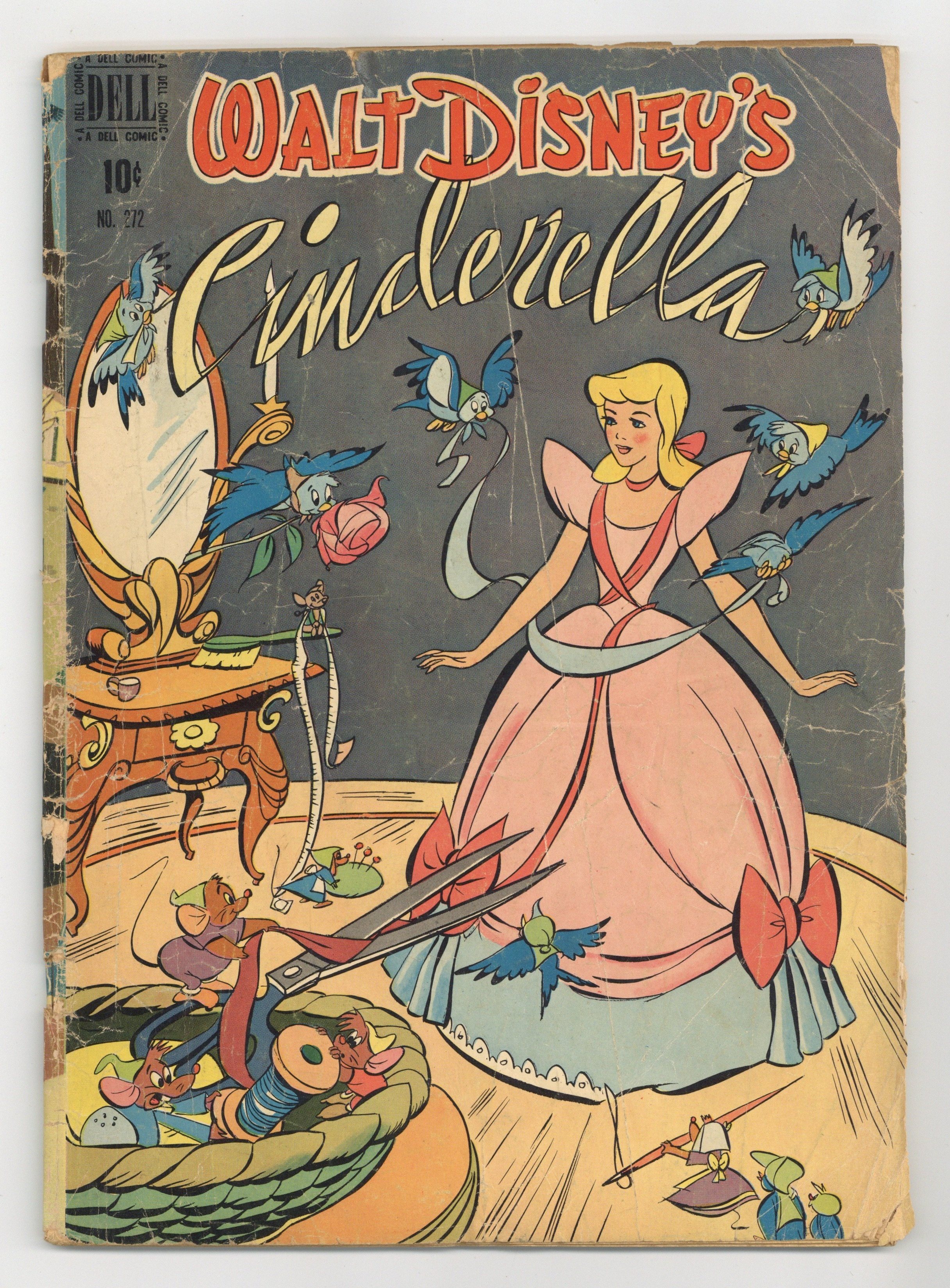 Indicia title is "Walt Disney's CINDERELLA, No. 272." Cover art by Dan Gormley. Inside front cover and inside back cover; Ten stills from the movie, printed in monochrome bluish-black ink, with a line of text underneath. Cinderella, script by Chase Craig, art by Dan Gormley; Cinderella, after being tormented by her evil stepmother and step-sisters, gets to go to the Prince's ball with the help of her Fairy Godmother; Adapted from the 1950 Disney animated movie "Cinderella." 52 pages, full color. Cover price $0.10.