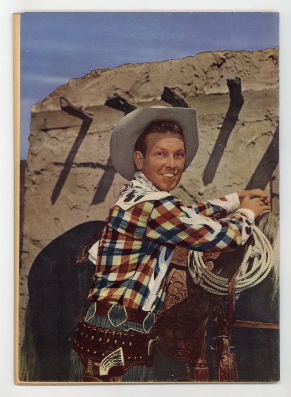 $28.00Rex Allen #1. Indicia title is "REX ALLEN, No. 316." Rex Allen photo cover. Posed photo of Rex playing a guitar inside cover photo. The Legacy, art by Jesse Marsh; When Rex goes to Oklahoma to investigate a claim on his uncle's estate, he is framed in the killing of a sheriff. Ghost Town Gun Runners, art by Jesse Marsh; Masked riders are attacking supply wagons to Mule Gulch to force the residents to leave. Rex riding his horse Koko inside back cover photo. Rex prepares to mount Koko, with adobe building in background back cover photo. 52 pages, full color. Cover price $0.10.