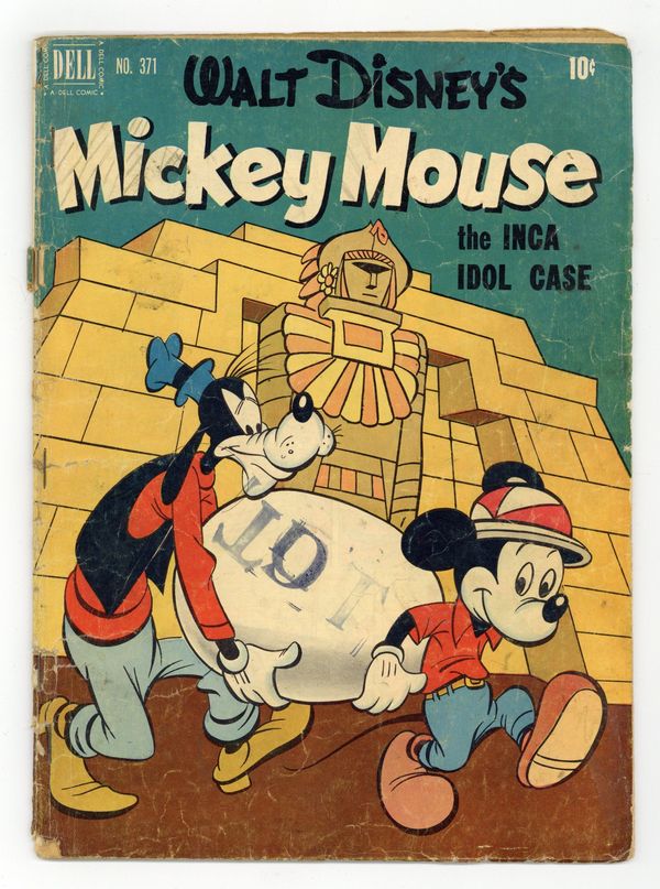 Cover art by Dan Gormley. Mickey Mouse and the Inca Idol Mystery; Two crooks use Mickey and Goofy to unknowingly help them smuggle the "Inca Idol" from the South American city of "Inca Blinka." Secret of the Pyramids; Mickey and Pluto are accidentally locked in a museum; Black Pete and El Cad break into the museum to steal the original plans of the pyramids from the mummy of King Tut-Tah-Tut. Car Phone back cover strip, art by Bill Weaver; Goofy has a pay phone installed in his car. 36 pages, full color. Cover price $0.10.