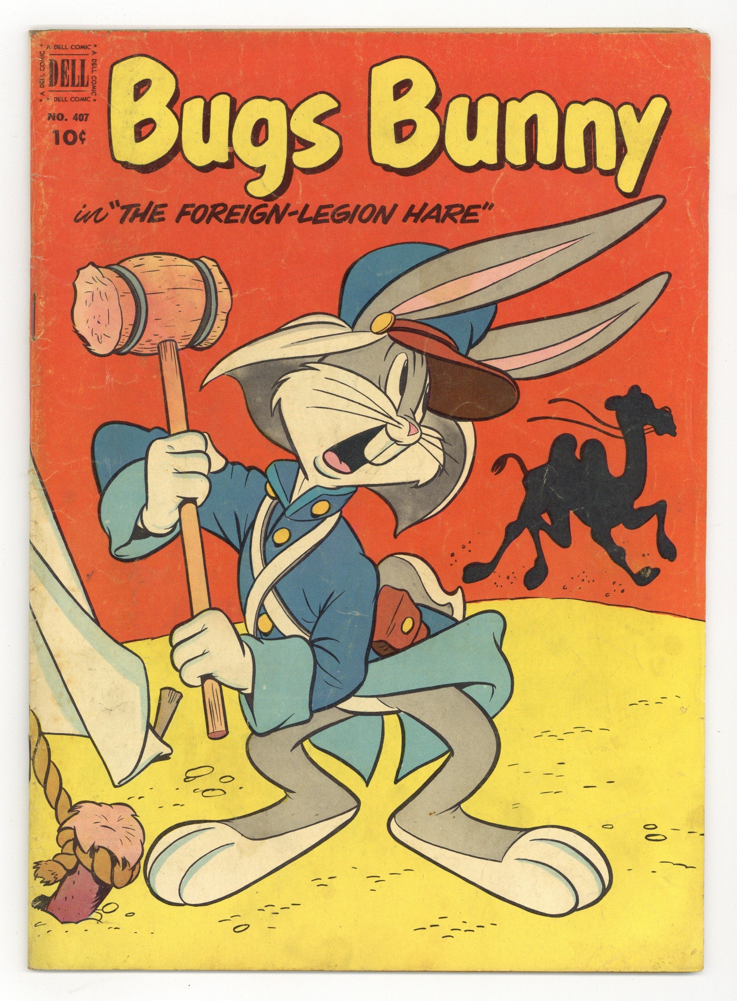 $5.60Indicia title is "BUGS BUNNY, FOREIGN LEGION HARE, No. 407." Cover art by Ralph Heimdahl. The Foreign Legion Hare, script by Don R. Christensen, art by Tony Strobl; Porky and Bugs stow away in a camel's crate thinking they are going to the circus; Instead the camel is being returned to his home in the Sahara Desert; After a long trip in a ship's cargo hold, Porky and Bugs arrive in port where they are discovered and mistakenly sign-up for the Foreign Legion. The Ferryboat Admiral, script by Don R. Christensen, art by Fred Abranz; Porky buys a ferryboat and, due to a mix-up, receives a telegram from the Navy to take the boat to a naval training exercise; Bugs and Sylvester go along; When they get there, Bugs and Porky go aboard the commander's ship, where they find the Navy wants to use their boat for target practice. Bon Bon Juggler back cover strip, art by John Carey. 36 pages, full color. Cover price $0.10.