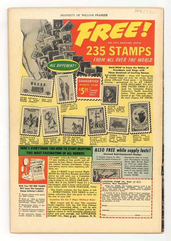 Cover art by Graham Ingels. Sucker Bait!--The Witch's Cauldron!, script by Albert B. Feldstein, art by Graham Ingels; After his father is killed by a vampire, a chemist comes up with a plan to sacrifice himself so that others may live. Lover, Come Hack to Me!--The Vault of Horror!, script by Albert B. Feldstein, art by George Evans; Every generation, a madwoman is conceived on the night of her parent's wedding who follows the tradition of murdering her newly-wed husband with an ax in the same house. Double-Header!--The Old Witch's Grim Fairy Tale!, script by Albert B. Feldstein, art by Jack Kamen. Foul Play!--The Crypt of Terror, script by Albert B. Feldstein, art by Jack Davis. 36 pgs. $0.10. Cover price $0.10.