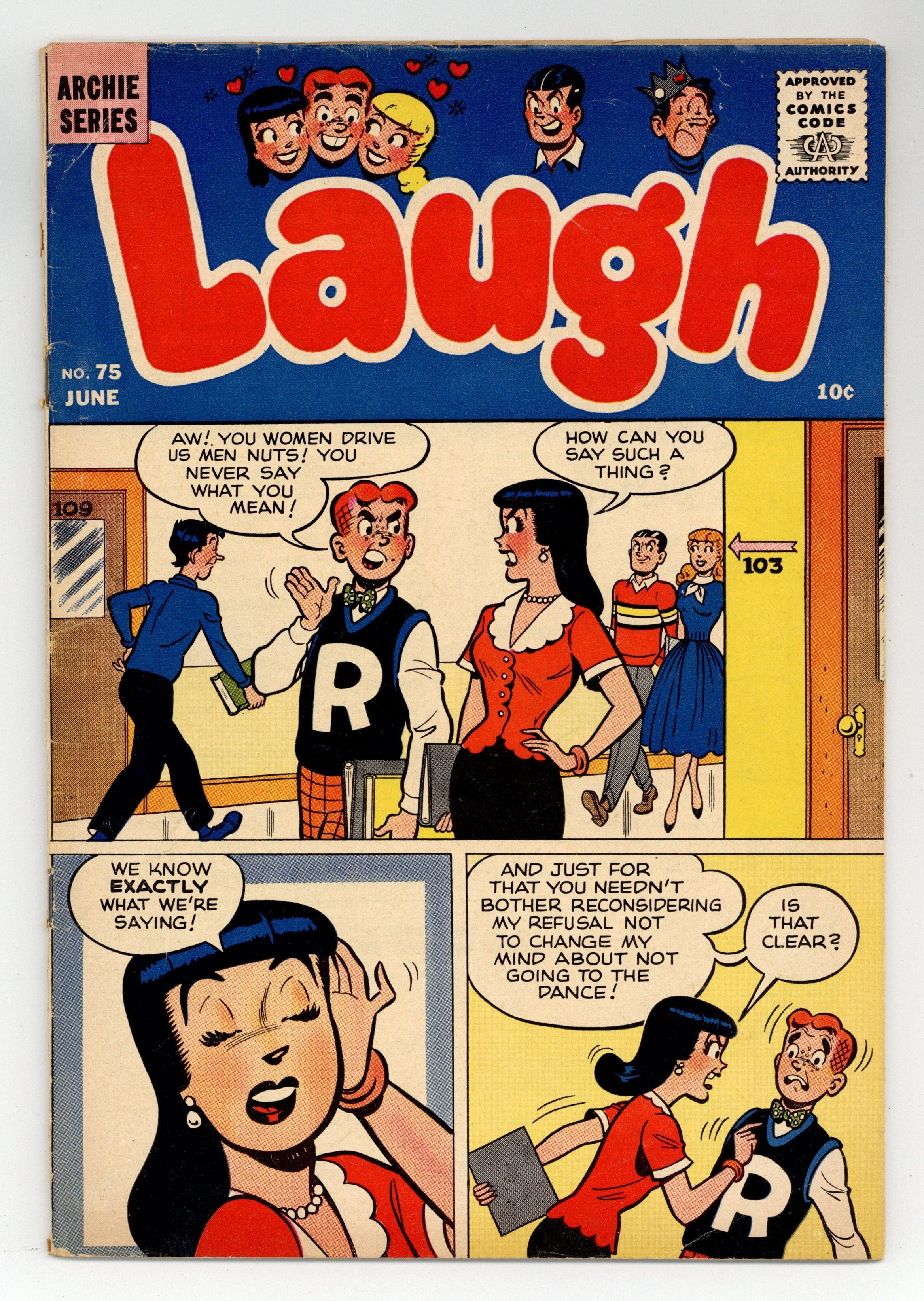 Cover art by Joe Edwards. "Sour Note," pencils by Bill Vigoda; Archie writes a nasty letter to Veronica when he hears that she went on the town with Jughead's cousin; He tries to get the letter back when he finds out that Jughead's cousin in a girl. "Cuttin' Up"; Pat the Brat cuts out the pictures of baseball players from the sports section before his father has read it. Untiled story, script by Bill Woggon, pencil by Hazel Marten (as Bill Woggon), inks by Cassie Bill (as Bill Woggon); Katy Keene needs K.O.'s help to rid her garden of a persistent chicken. Untitled Katy Keene story; Randy tries to trick K.O. with a sucker bet. "Skip, Hop, and Thump," script by Frank Doyle, pencils by George Frese, inks by Terry Szenics; Neither Betty or Veronica get to take Archie to the sock hop. "Chump of Chumps!" text story. "To the Victor!", pencils by Dan DeCarlo; While Betty is getting ready for their date, Archie plays scrabble with Betty's dad. "Gentlemen to the End," art by Joe Edwards; Wilbur and Slats both show up at the same time to ask Laurie for a date. "The High and Mighty," pencils by Dan DeCarlo; Jughead tells Moose to back down as he has friends in high places. "Just Picture It!", pencils by Bill Vigoda, inks by Red Holmdale; Reggie needs a date, and Jughead has a spare. 36 pgs., full color. Cover price $0.10.