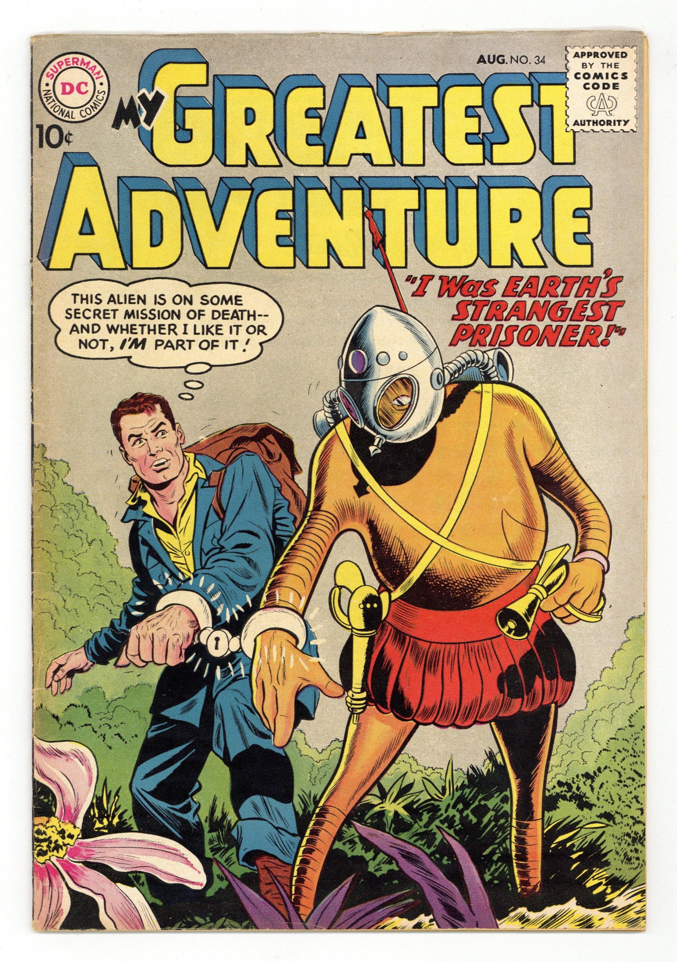Cover pencils by Dick Dillin, inks by Charles Paris. We Unleashed the Cloud Creatures, art by Lee Elias; An experiment to try to create "portable cloud" technology--move a raincloud somewhere where rain is needed, for example--goes awry, and creates cloud creatures capable of absorbing huge supplies of water. Dr. Floogle humor page by Henry Boltinoff. I Fought the 100-Year Gold Curse!, art by Mort Meskin; It's just after midnight when Mike hears of his inheritance from his great-grandfather. Palisades Amusement Park ad with Superman. Alien's Bodyguard text story by Jack Miller. I Was Earth's Strangest Prisoner, art by Nick Cardy; Wallace in on site for the construction of a new bridge, but the workers won't work because of reports of an alien with a weapon that's attacked some of the workers. 36 Pages, Full Color. Cover price $0.10.