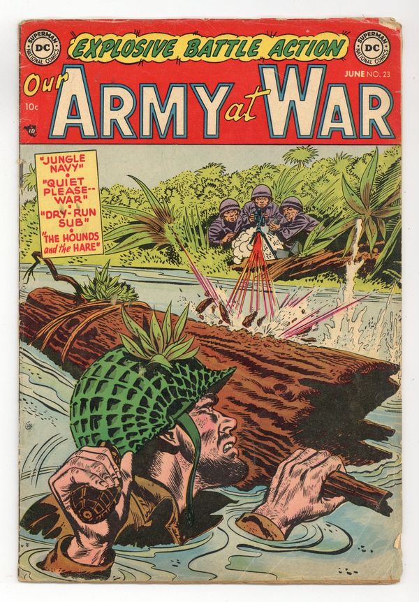 Cover art by Irv Novick. Jungle Navy, script by Bob Kanigher, art by Jerry Grandenetti. Quiet Please—War, script by John Reed, art by Irv Novick. The Dry Run Sub, script by William Woolfolk, art by Russ Heath. The Hounds and the Hare, script by David Kahn, pencils by Jerry Grandenetti, inks by Frank Giacoia. 36 Pages, Full Color. Cover price $0.10.
