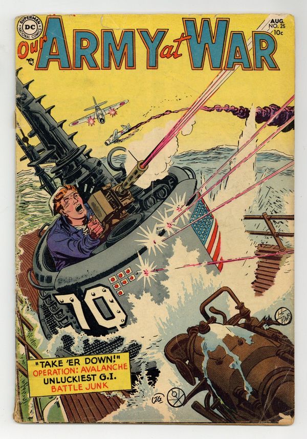 Cover art by Jerry Grandenetti. Take 'Er Down, script by Bob Kanigher, art by Jerry Grandenetti. Battle Junk, script by Ed (France) Herron, art by Mort Drucker. Unluckiest GI, script by William Woolfolk, art by Eugene Hughes. Operation Avalanche, script by Bob Kanigher (as Causin), art by George Papp. 36 Pages, Full Color. Cover price $0.10.