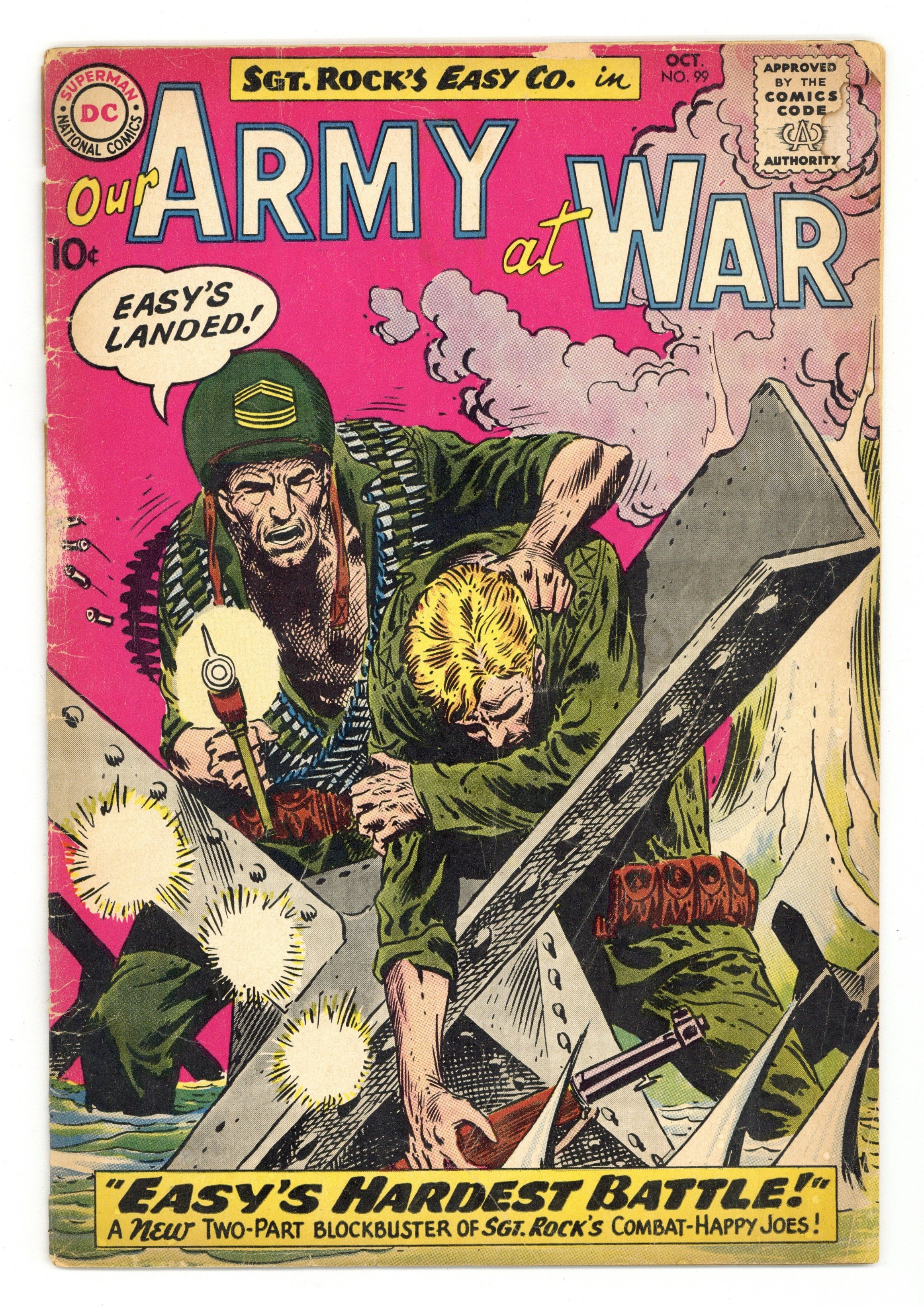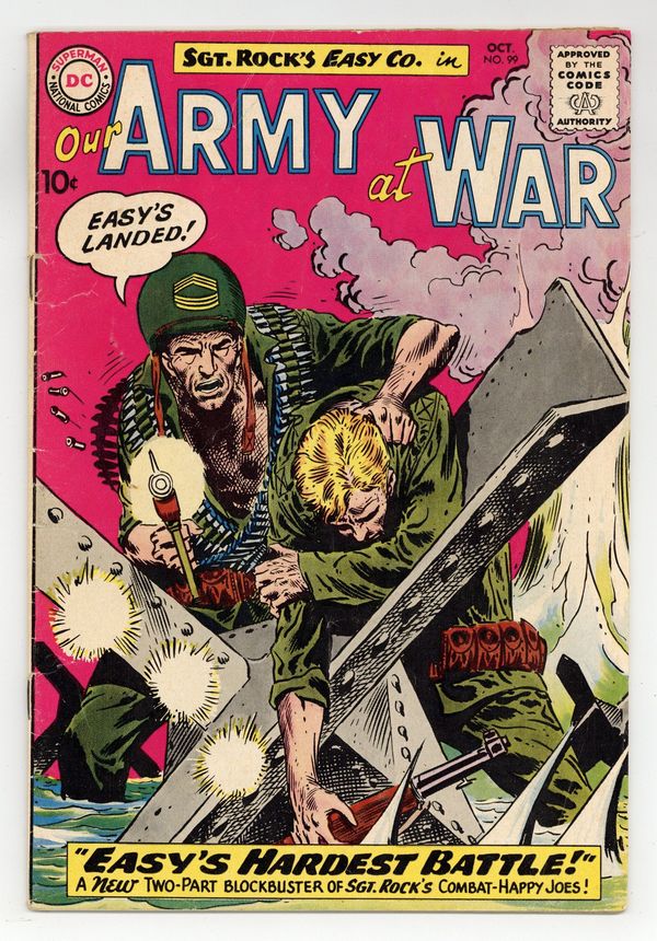 Starts May 11 Cover art by Joe Kubert. Easy's Hardest Battle starring Sgt. Rock, script by Bob Kanigher, art by Joe Kubert. We're Still Flying, script by Bob Haney, pencils by Ross Andru, inks by Mike Esposito. Booby-Trap Tank, script by Bob Haney, art by Jack Abel. 36 Pages, Full Color. Cover price $0.10.