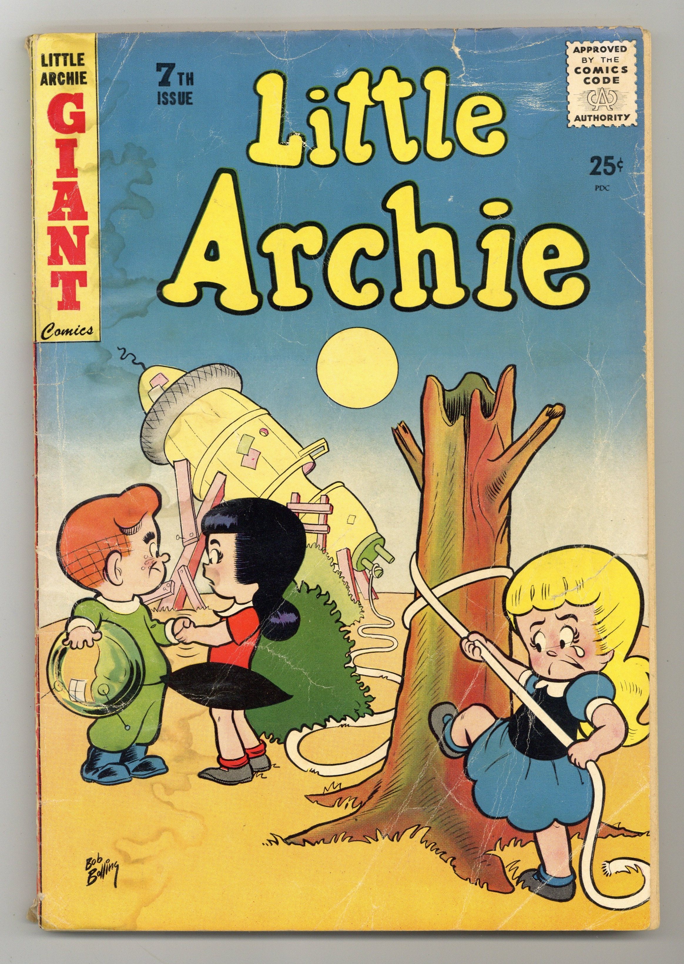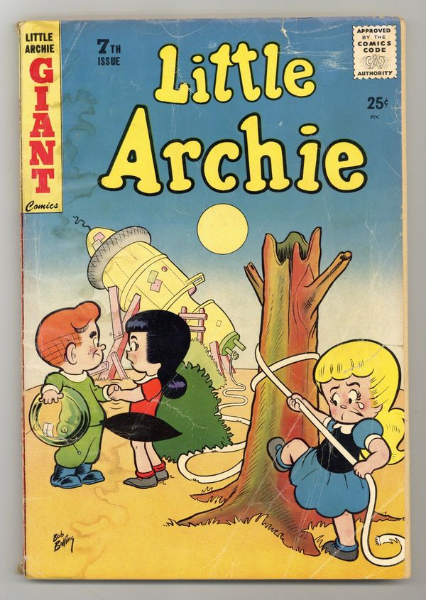 Cover art by Bob Bolling. Kiss and Tell, art by Bob White; Ronnie and the boys act out good-guy and bad-guy scenarios from TV. Magic Madness, script and art by Dexter Taylor; Little Archie gets a magic kit and puts on a magic show. The Bunny Hop one-pager starring Bunny. Oh, Brother starring Scotty and Dotty, script and art by Samm Schwartz; Dotty argues with another girl over whose brother is better. Hood Winked; The kids play "Little Red Riding Hood." Cape Capers, pencils by Bill Vigoda; The girls claim to have a friend whose magic cape makes her invisible. No Stone Unturned!, pencils by Samm Schwartz; The boys are forced to go on a picnic with the girls. 84 pgs. $0.25. Cover price $0.25.