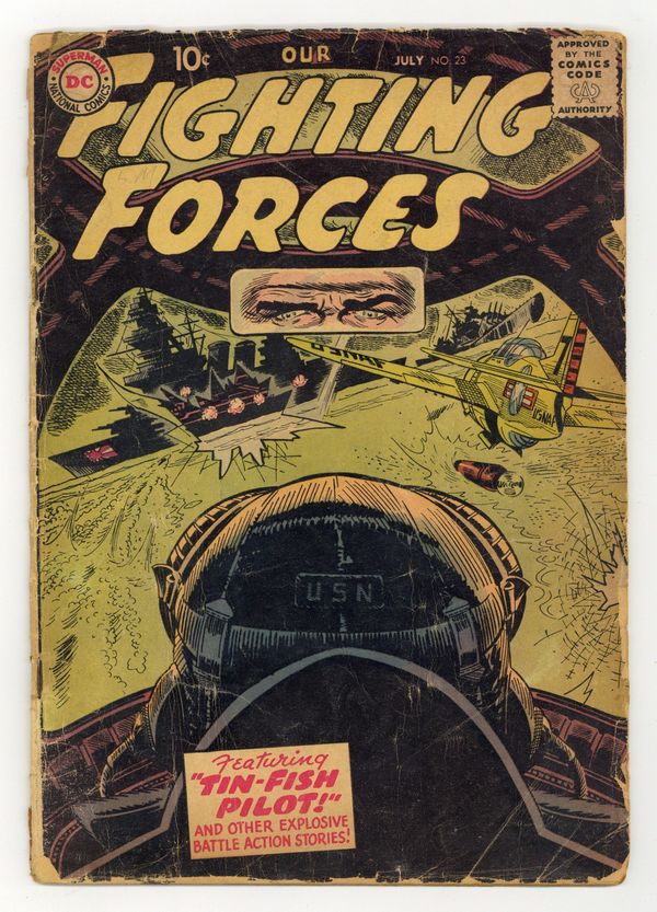 Cover by Jerry Grandenetti. Stories by Robert Kanigher, Bill Finger and Ed Herron. Art by Ross Andru, Irv Novick, Jack Abel, Joe Kubert and Mike Esposito. Explosive battle action tales! In this issue: "Tin Fish Pilot!" by Robert Kanigher, Ross Andru and Mike Esposito; "Police Up the Area!" by Bill Finger and Irv Novick; "Rookie Tank!" by Ed Herron and Jack Abel; and "Don't Fire Back!" by Herron and Joe Kubert. Plus: 2-page text article "Mighty Missy"; Aviation Almanac! half-pager; and Shorty 1-pager by Henry Boltinoff, reprinted from Star Spangled War Stories (1952 DC #3-204) #4. 36 Pages, Full Color. Cover price $0.10.