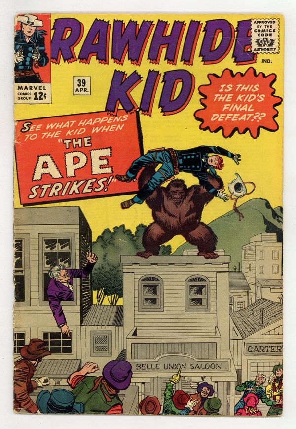 Cover by Jack Kirby and Chic Stone. Stories by Stan Lee. Art by Dick Ayers and Jack Keller. Is this the Rawhide Kid's final defeat? See what happens to the Kid when..."The Ape Strikes!" by Stan Lee and Dick Ayers. Also in this issue: Back-up story "The Frightened Man" by Lee and Jack Keller. Plus: A boy grows up to be a loner because of taunts, but when he sees another youth with a similar problem in danger he reaches out and finds the acceptance of the community in the 2-page text story "The Loners," reprinted from Apache Kid (1950) #15. 32 pages, full color. Cover price $0.12.