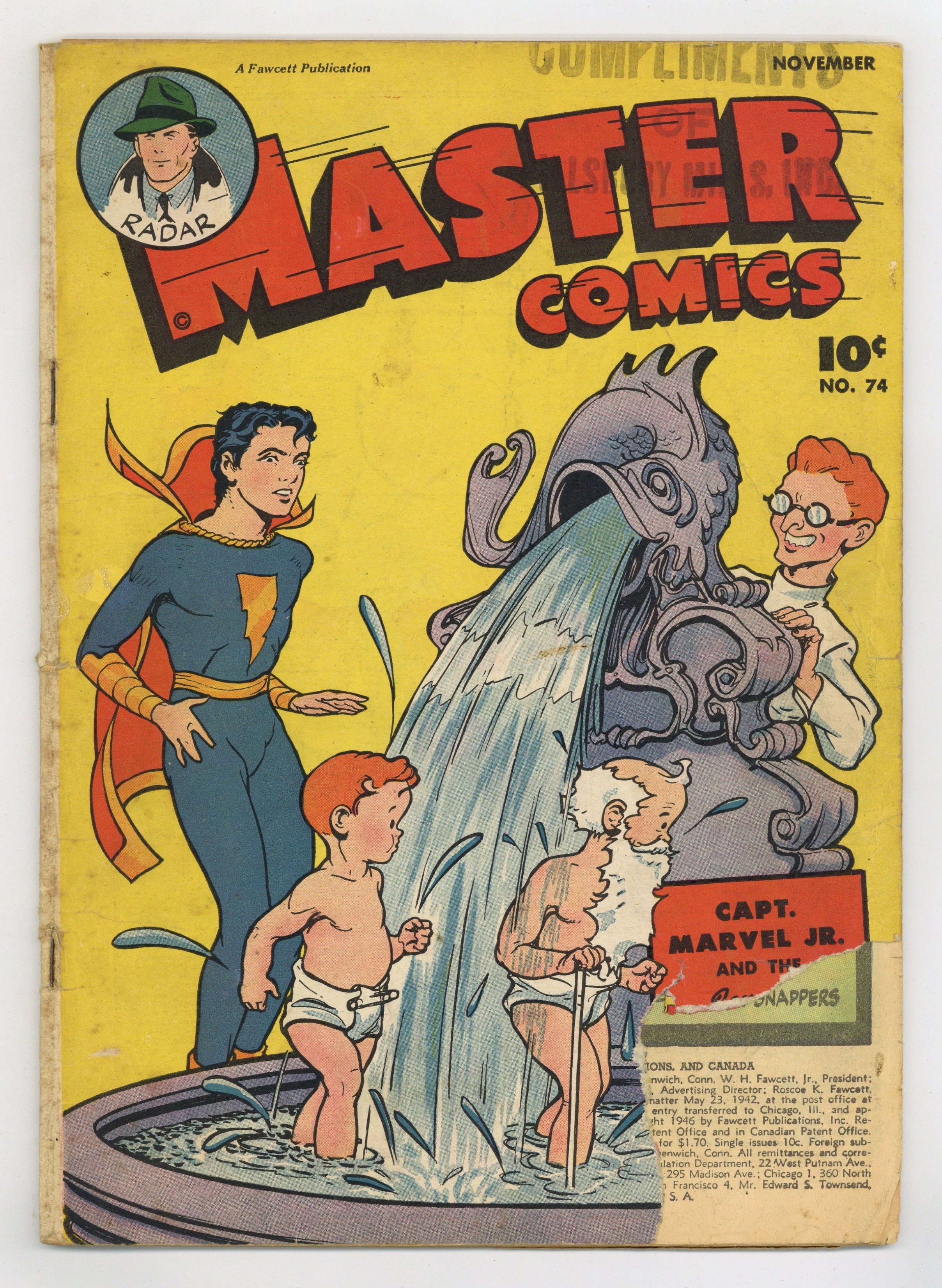 Cover by Bud Thompson. Stories and art by Bud Thompson, Howard Boughner and W. Jourdain. Fawcett's showcase for comics covers the humor, Western, adventure and superhero genres, featuring Captain Marvel Jr., Bulletman and Bulletgirl. Action girl Nyoka meets a woman of the jungle who's even more feral than she is. Bulletman and Bulletgirl must play detective when a mystery writer is the center of a mystery. Sivana Jr's latest discovery is a "Fountain of Age" that turns babies into old men. Captain Marvel, Jr.; The Fountain of Age; Dance Time; Giggle Gags; For the Master Mind; Colonel Corn and Korny Kobb; Spanish Gold; Nyoka, the Jungle Girl: The Wild Woman; Lumber Jack; Trader Tom; The Tragedy of Joe Miller; Bulletman: Mystery Writer's Mystery; Radar: General Tobaro's Mission; Whipper-Snappers. 48 pages, Full Color. Cover price $0.10.