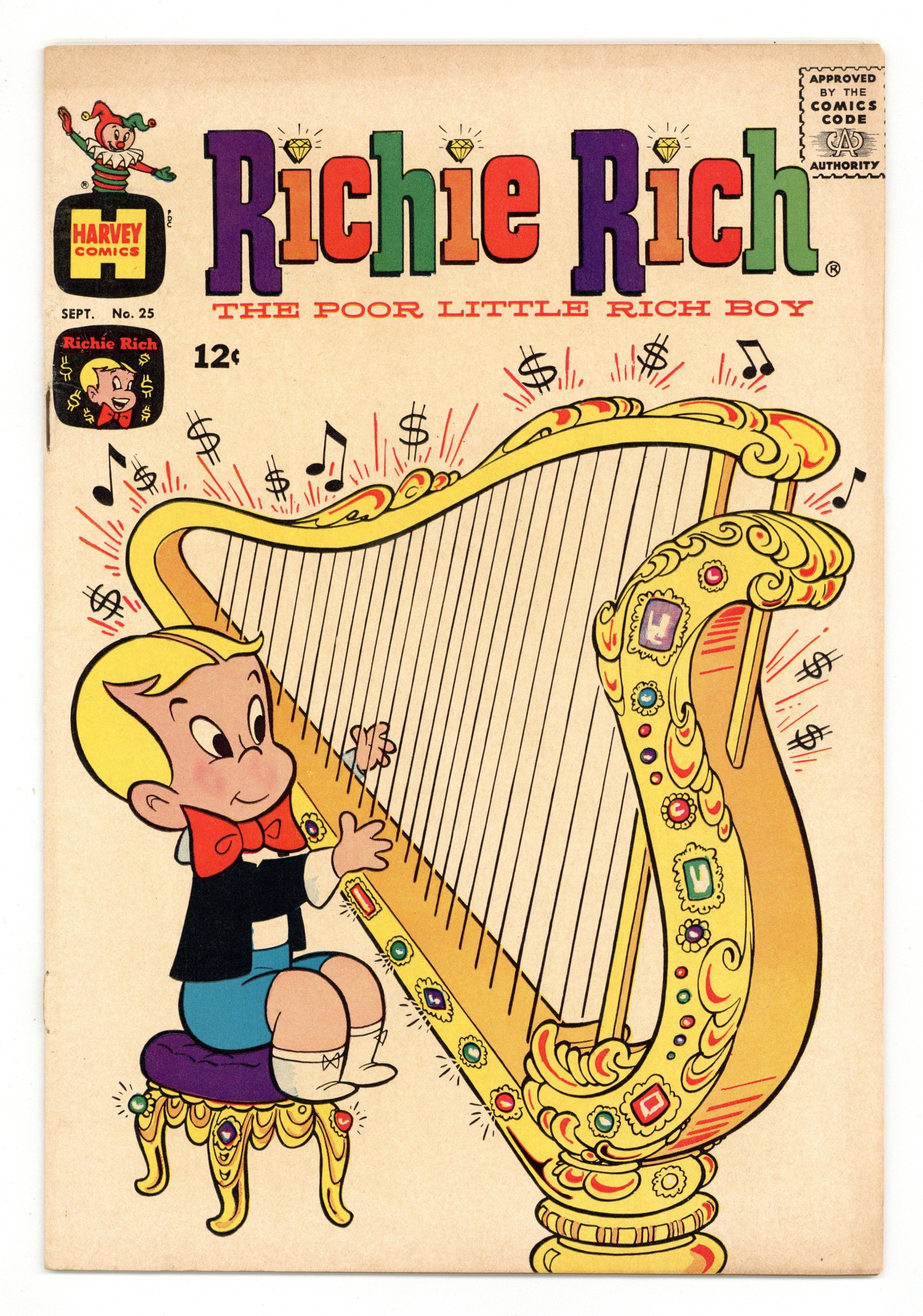 Harvey's flagship title featuring the adventures of Richie Rich, the richest kid in the world. Richie hires a beatnik sculptor to make a statue of Gloria, and it's a good thing Gloria likes modern art. Richie accidentally breaks his robot baby-sitter, so now she has the mind of an infant, but still with a robot's super-strength. Plus a vintage ad for Cheerios featuring Rocky and Bullwinkle. Tinka; Sitting Pretty Awful; Little Dot: That Wonderful Rope; Richie and the Bread Line; Little Lotta: Work Try-out. 32 pages, Full Color. Cover price $0.12.