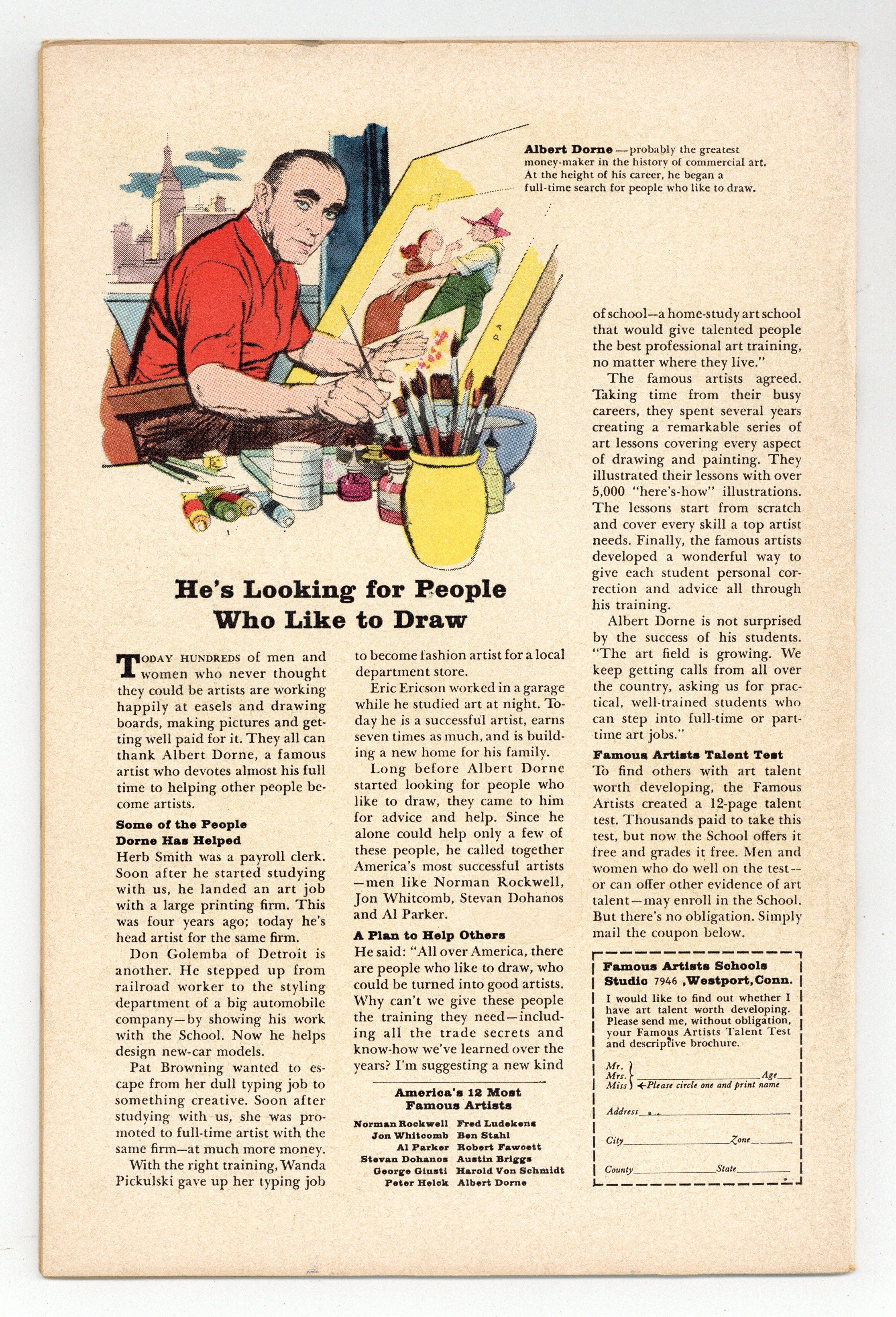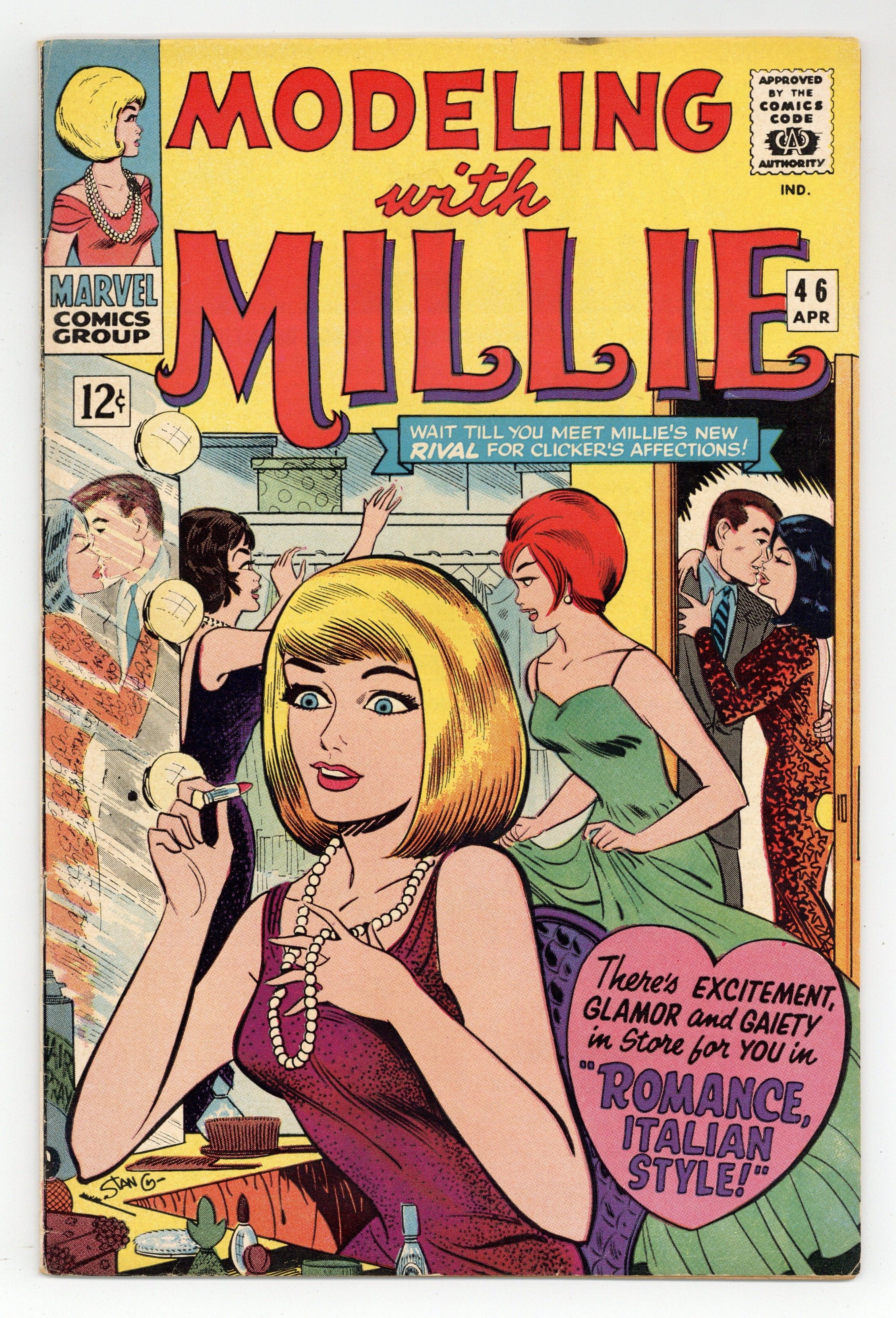 Cover art by Stan Goldberg. Romance--Italian Style!, script by Roy Thomas and Denny O'Neil, pencils by Stan Goldberg, inks by Sol Brodsky; Italian movie star Gina Felicini makes a big play for Clicker, even announcing their engagement in the gossip columns without his knowledge. Millie Loves Gloves! fashion page, pencils by Stan Goldberg. Statement of October 1, 1965; average paid circulation for previous 12 months: 204,756. In the Days of Old! fashion page, art by Stan Goldberg; Millie dressed as a Roaring Twenties flapper. 36 pgs. $0.12. Cover price $0.12.
