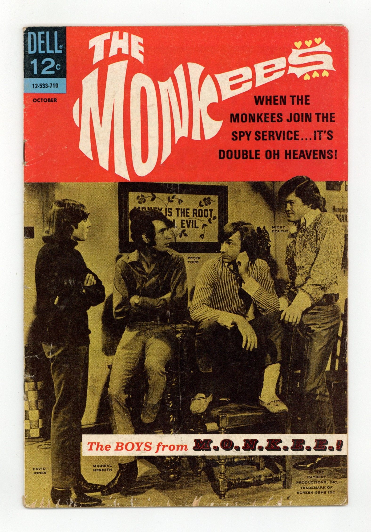 Photo cover features Peter Tork, Michael Nesmith, Micky Dolenz, and Davy Jones. Art by Jose Delbo. Cover number is 12-533-710. Dell's comic about the TV rock band does surprisingly well at capturing the madcap, absurd humor of the beloved show. A producer from Magnificent Studios wants to put the boys in a movie. The Monkees are trapped on a runaway sofa, as it rolls uncontrollably through traffic and onto a racetrack. It was bound to happen, once the Monkees got their own comic book: they become superheroes. The Monkees in the Movies?; Sofa… So Good; The Boys from M.O.N.K.E.E.! 32 pages, Full Color. Cover price $0.12.