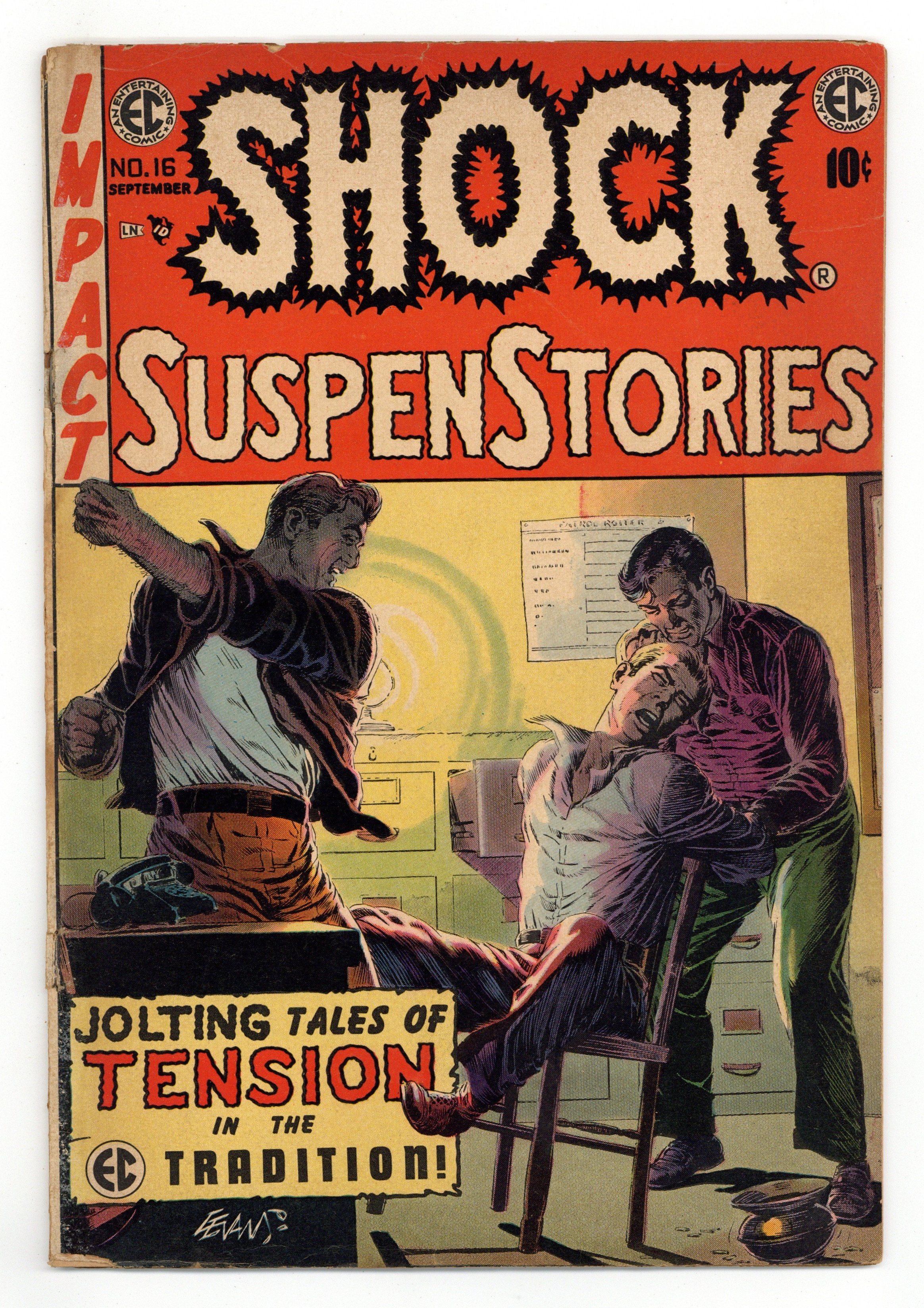 Cover art by George Evans. "Are You A Red Dupe" editorial on interior front page. ...My Brother's Keeper, script by Carl Wessler, art by George Evans; An evil Siamese twin murders but the state does not execute him as it would mean the death of the good one. The good one finally commits suicide to halt the evil of the other. The Hazing, art by Joe Orlando; A college student wants to join a frat so he makes up a story about a professor they don't like being a communist in order to get him fired. Slob! text story by Albert B. Feldstein. A Kind Of Justice, script by Carl Wessler, art by Reed Crandall; A mob beat a vagrant to death for the rape of a sixteen year old girl that the town sheriff has been violating. The Pen Is Mightier, script by Carl Wessler, art by Jack Kamen; A newspaper columnist murders his gangster friend to get his wife and frames an innocent man for the crime through the power of his words. 36 pgs. $0.10. Cover price $0.10.