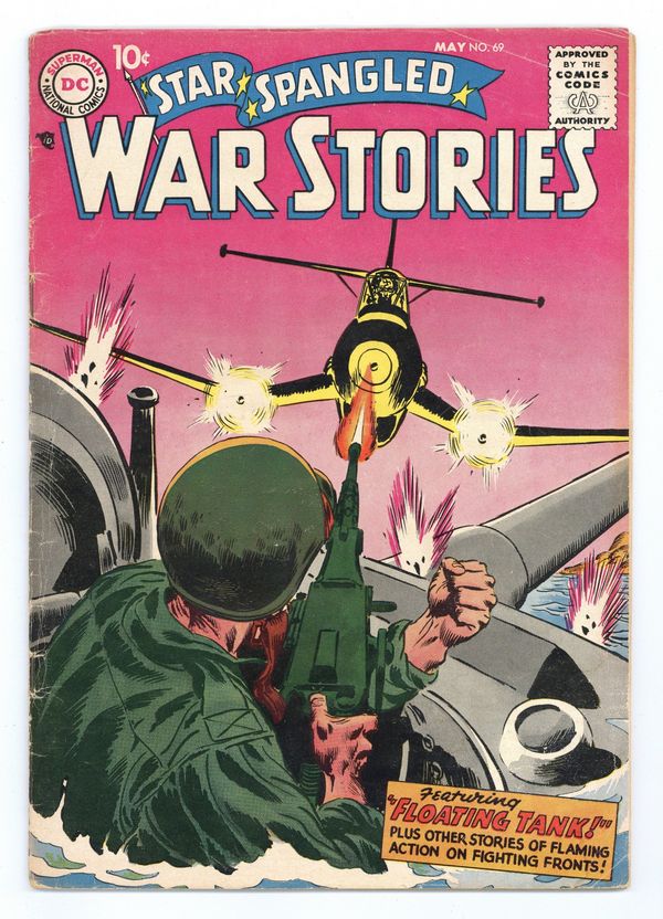 Cover art by Joe Kubert. The Floating Tank, script by Bob Haney, art by Joe Kubert. Sub on my Doorstep, script by Bob Haney, pencils by Ross Andru, inks by Mike Esposito. Sixty Second Day, script by Robert Kanigher, pencils by Ross Andru, inks by Mike Esposito. Dress-Parade Soldiers, script by Bill Finger, pencils by Bob Forgione, inks by Jack Abel. Army Brigade Nicknames, script and pencils by Morris Waldinger, inks by Tom Nicolisi. May it Live Forever, script and pencils by Morris Waldinger, inks by Tom Nicolisi. 36 Pages, Full Color. Cover price $0.10.