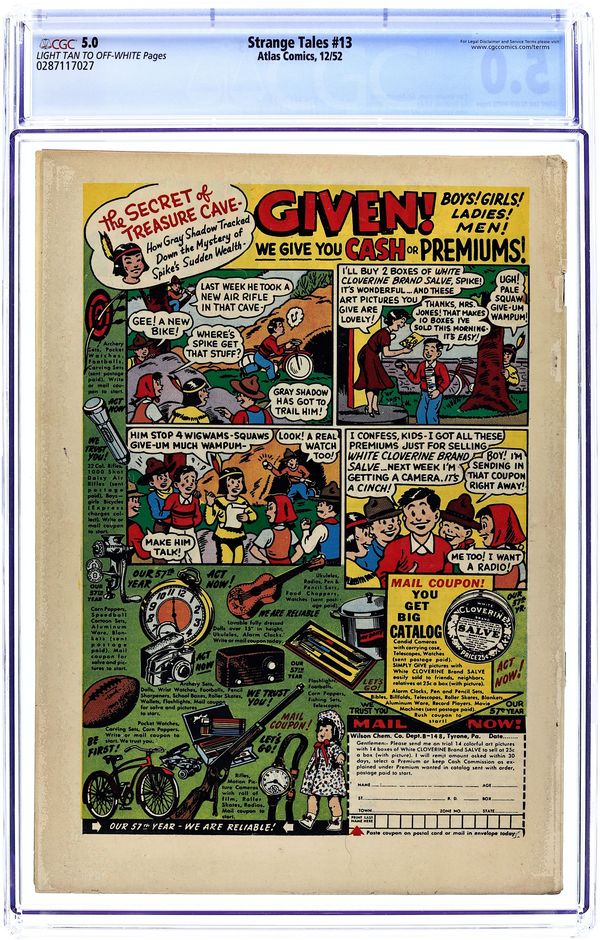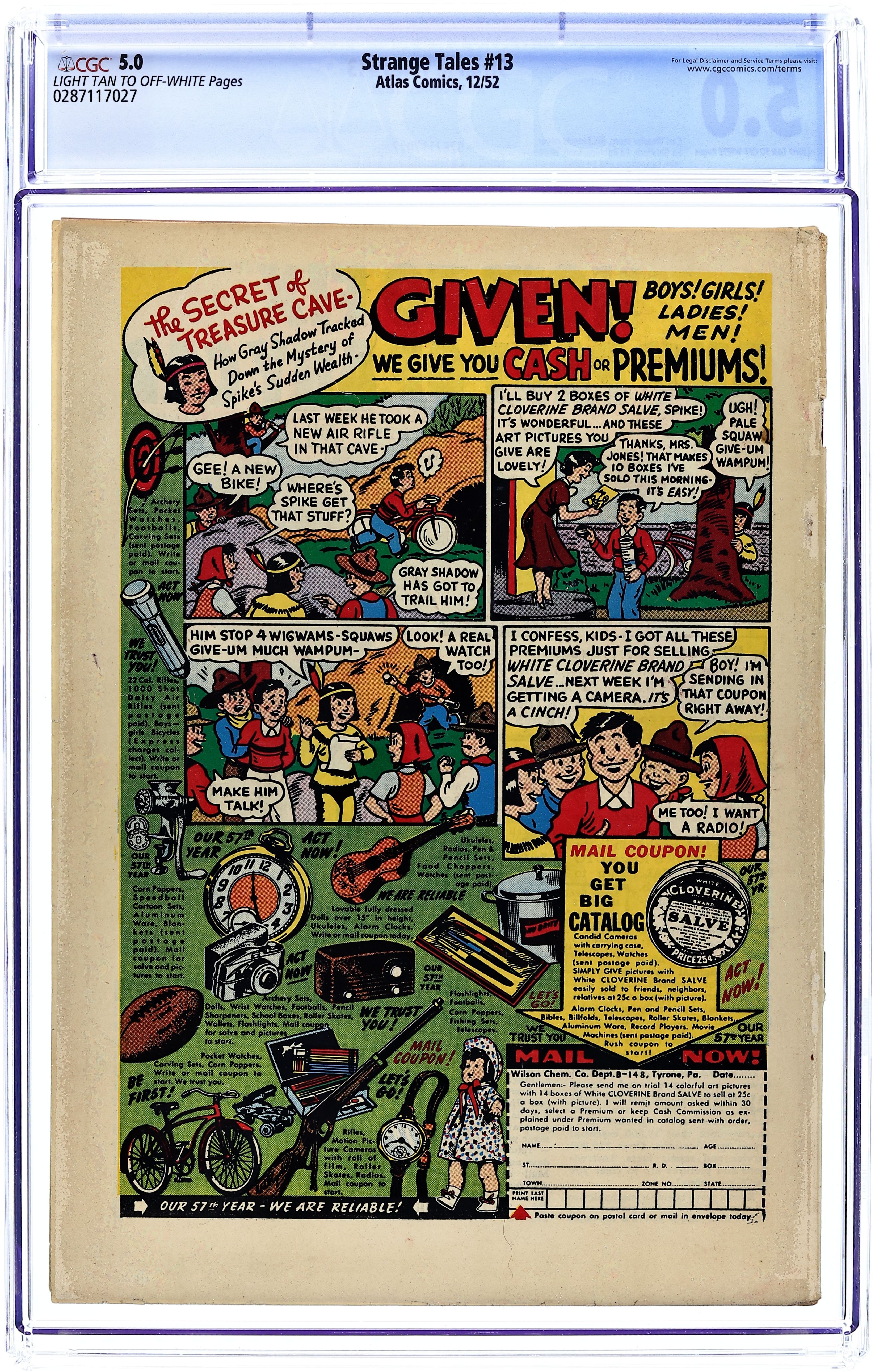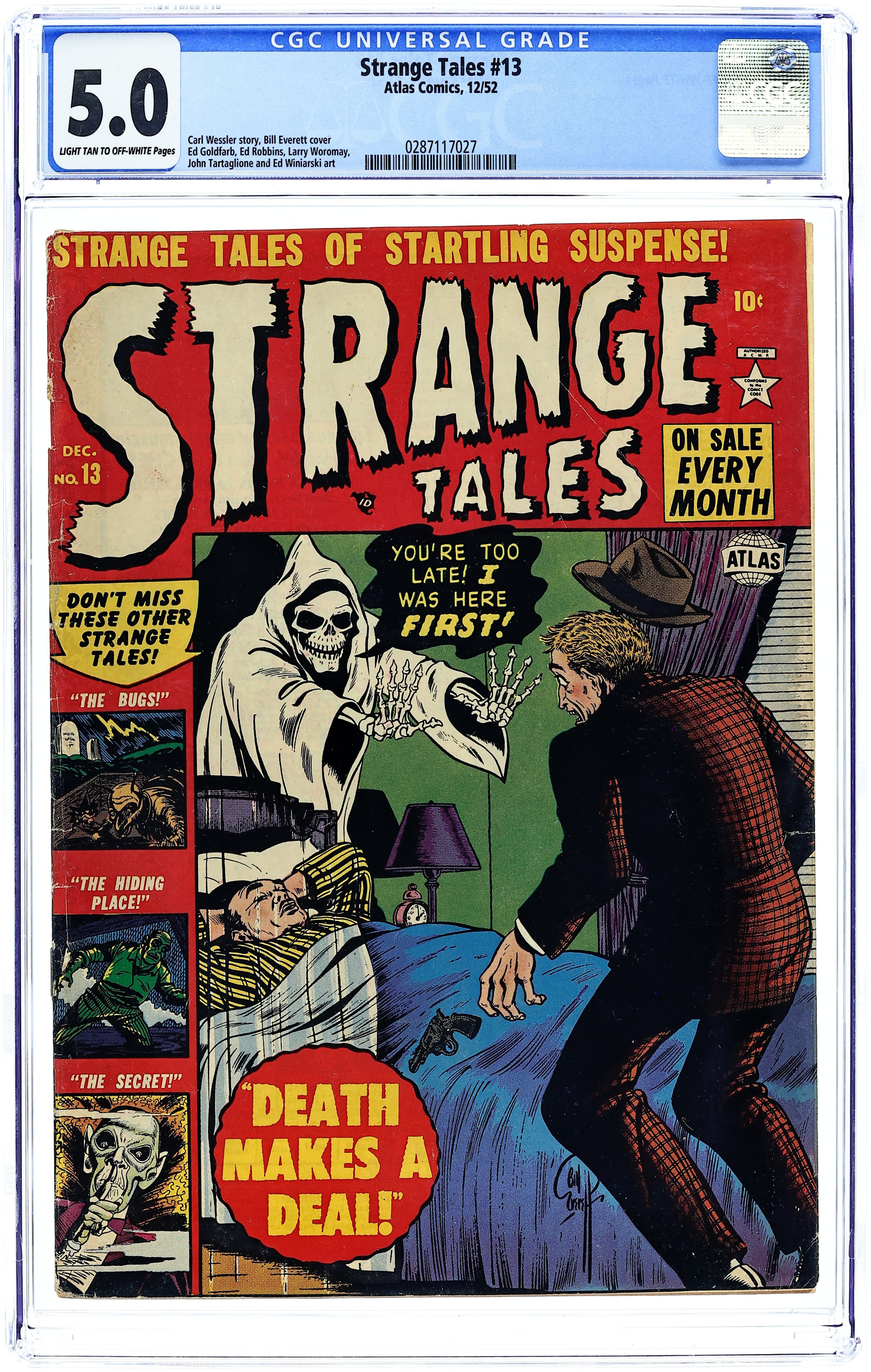 Cover art by Bill Everett. The Witching Hours!, art by Ed Goldfarb; A man marries the beautiful daughter of a witch. The Power of Hatred text story. Death Makes a Deal!, art by Ed Robbins; A washed-up reporter needs to come up with a scoop or he will be fired; He meets Death, who reveals future tragedies to him so that he can write up the stories. The Hiding Place, script by Carl Wessler, art by John Tartaglione; Three crooks hide the money they've stolen and agree to retrieve it in a year. The Bugs, art by Larry Woromay. The Secret of Christopher Morse, art by Ed Winiarski. 36 pgs. $0.10. Cover price $0.10.